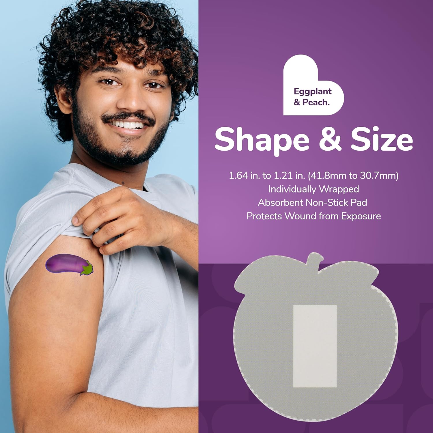 BioSwiss Bandages, Eggplant and Peach Shaped Adult Self Adhesive Bandage, Latex Free Sterile Wound Care, Funny First Aid Kit Supplies for Adults, 50 Count
