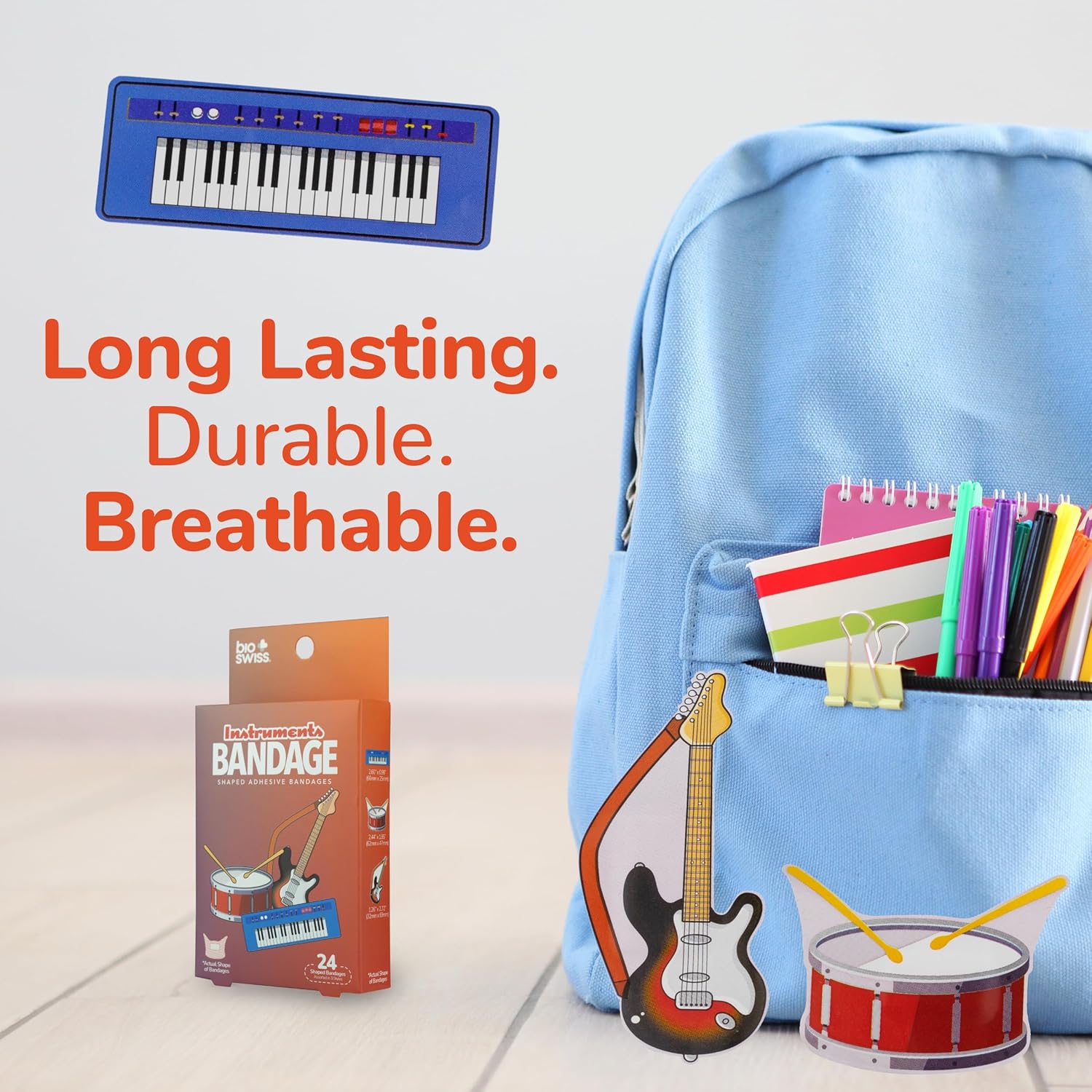 BioSwiss Bandages, Musical Instruments Shaped Self Adhesive Bandage, Latex Free Sterile Wound Care, Fun First Aid Kit Supplies for Kids and Adults, 24 Count