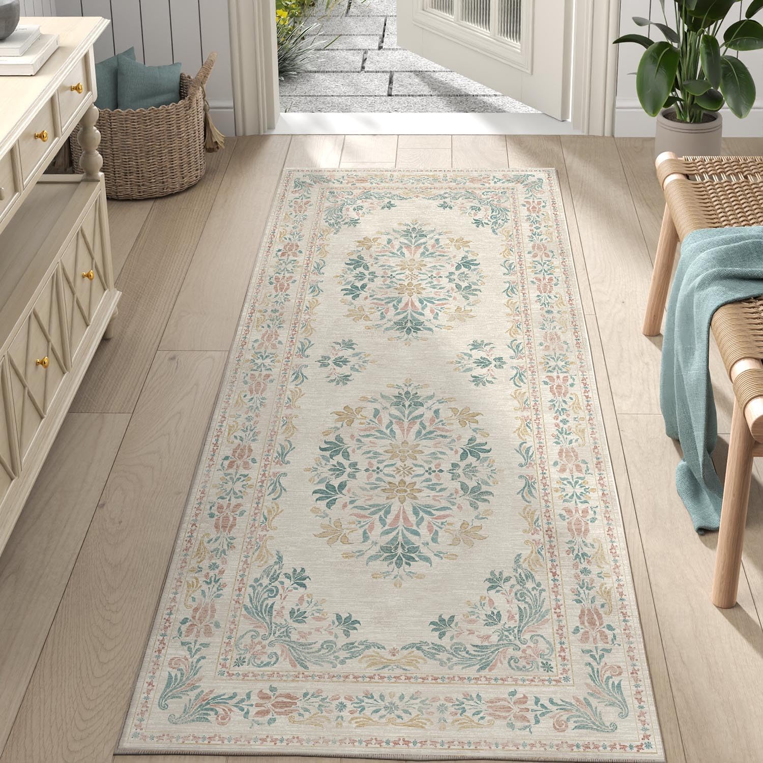 jinchan Vintage Floral Runner Rug 2x5 - Machine Washable Distressed Design Non-Slip Low-Pile Soft Thin Carpet for Hallway Kitchen Farmhouse Bedroom Entryway Laundry Room (2x5ft,Apricot Multi)