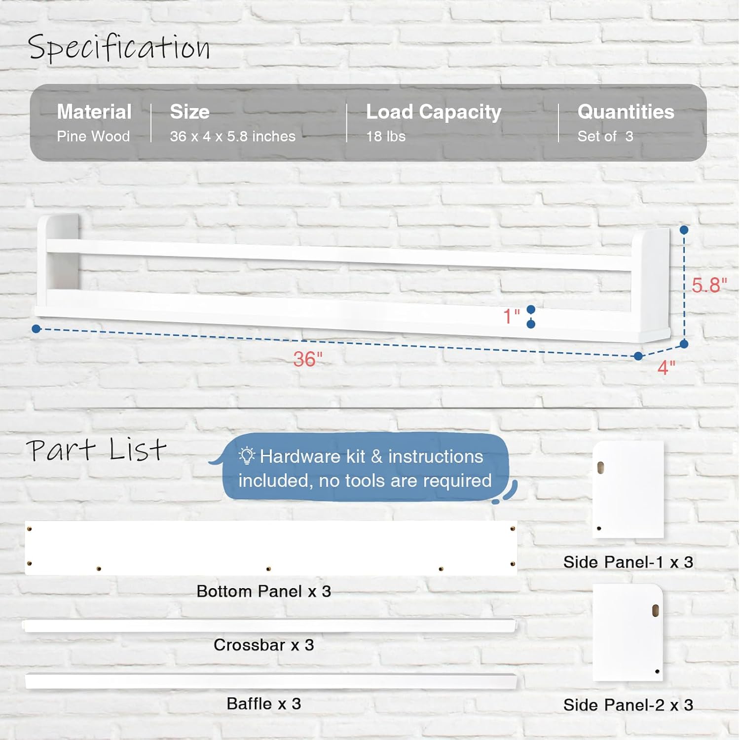 - [Premium Material and Easy to Install] These nursery book shelves are made of solid pine wood (real pine) with advanced manufacturing processes. The package included all mounting hardware and a clear installation manual. You will easily be able to assemble those nursery wall shelves within minutes. The durable nursery shelves can hold up to 18 lbs.