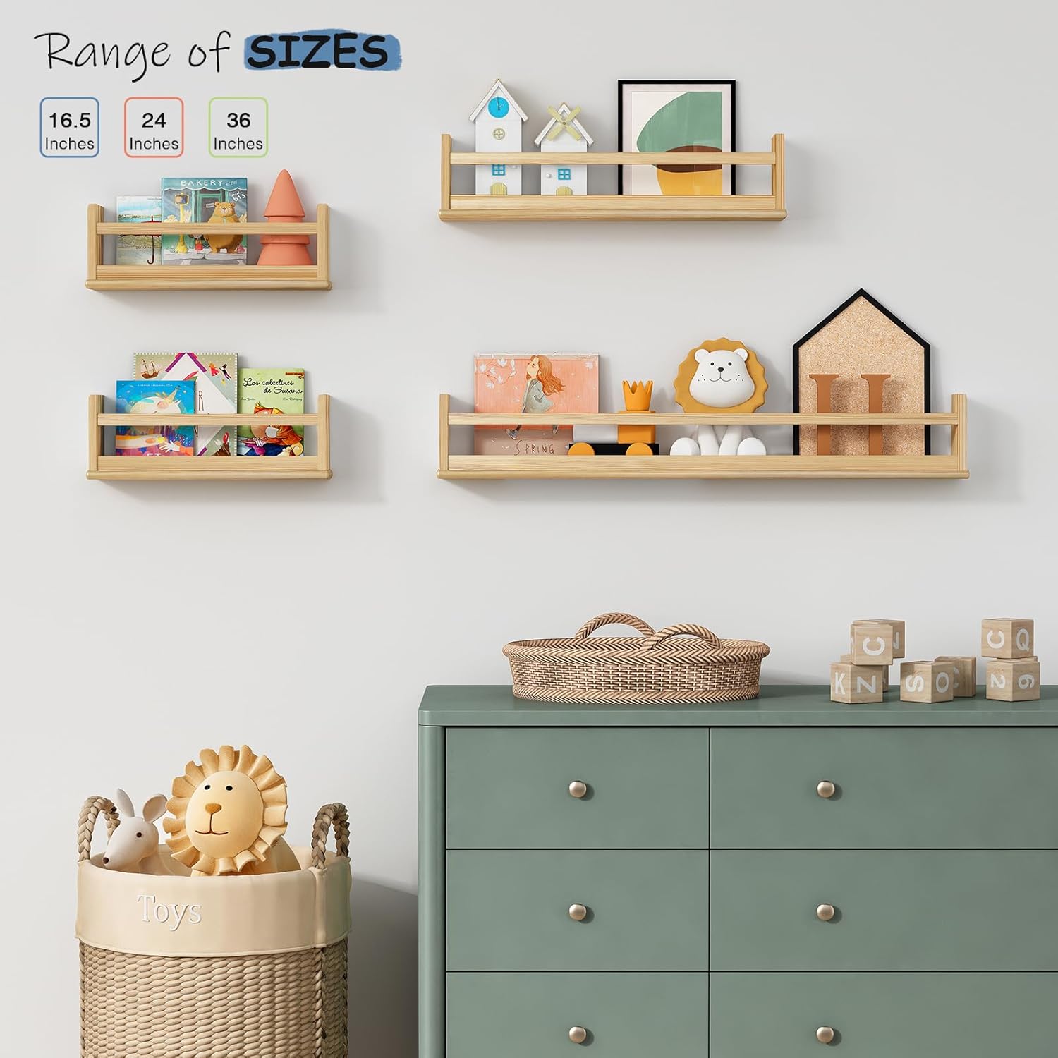 - [Versatile & Multifunctional Bookshelf] The wooden kids wall bookshelves are no limit to creativity! Place them as wall mounted bookshelf for kids bedroom, baby bookshelf for nursery, and toy organizers for playrooms. Mount them upside down as kids clothes shelves in the bathroom and closet. They're going to fit any space and any style thanks