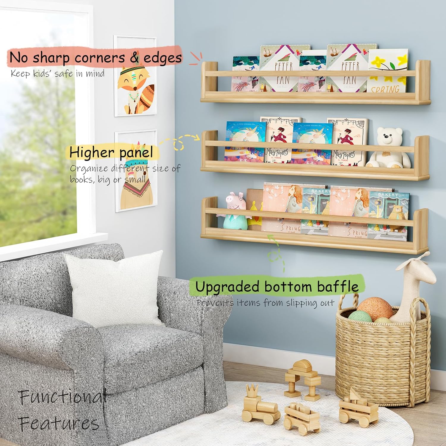 - [Perfect Wall Bookshelf for Kids Room] Without taking up any floor space, mount these floating kids bookshelves on your nursery wall or kids bedroom. Kids can easily place picture books, stuffed animals, and toys on wall shelving, where they'll be off the floor and easy to reach by themselves.