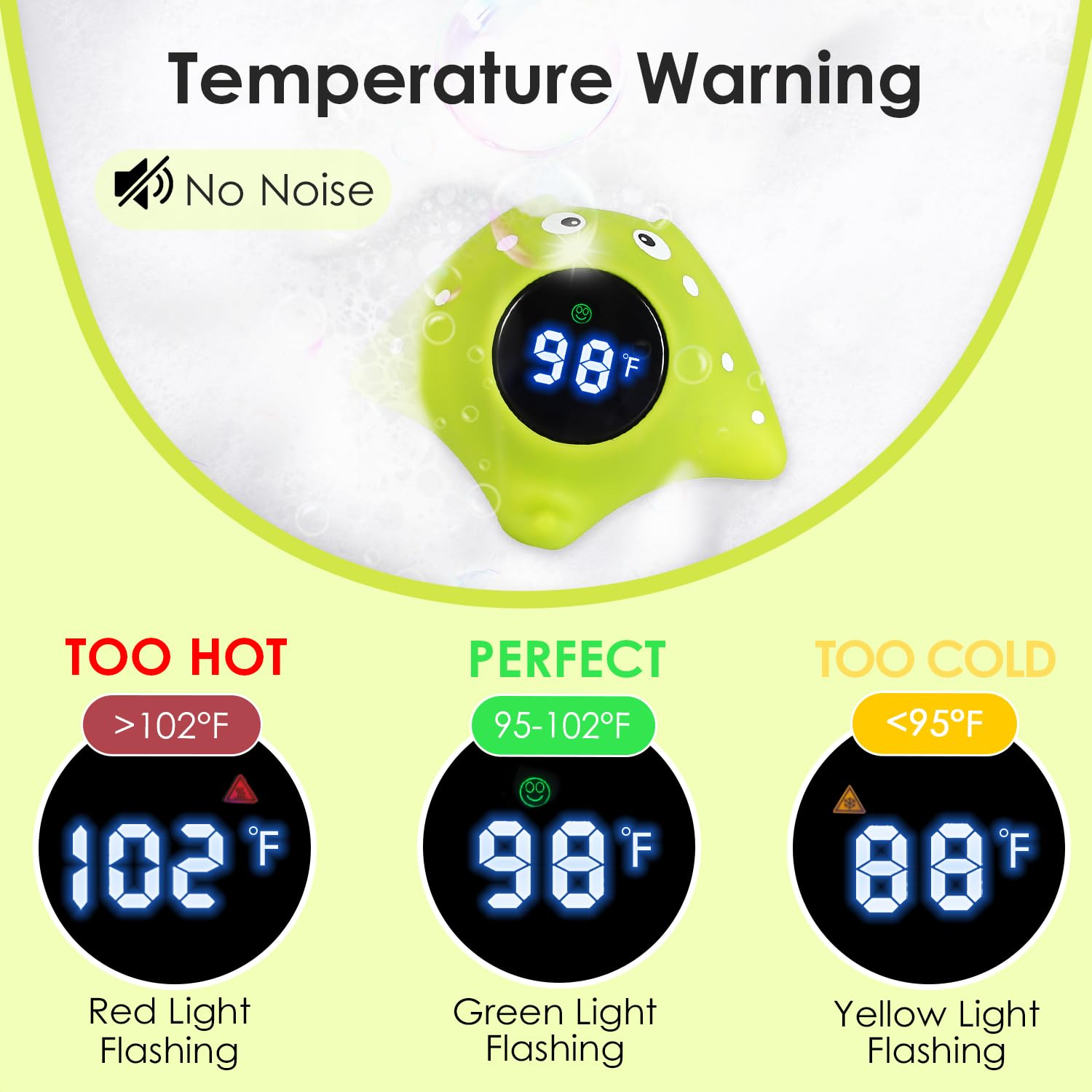 - Temperature Alarm - Bath thermometer uses vibrant lights to alert you the temperature instantly. A red light flashing if the water is too hot, a blue light flashing if it's too cold, and a delightful green light shining when the temperature is appropriate.