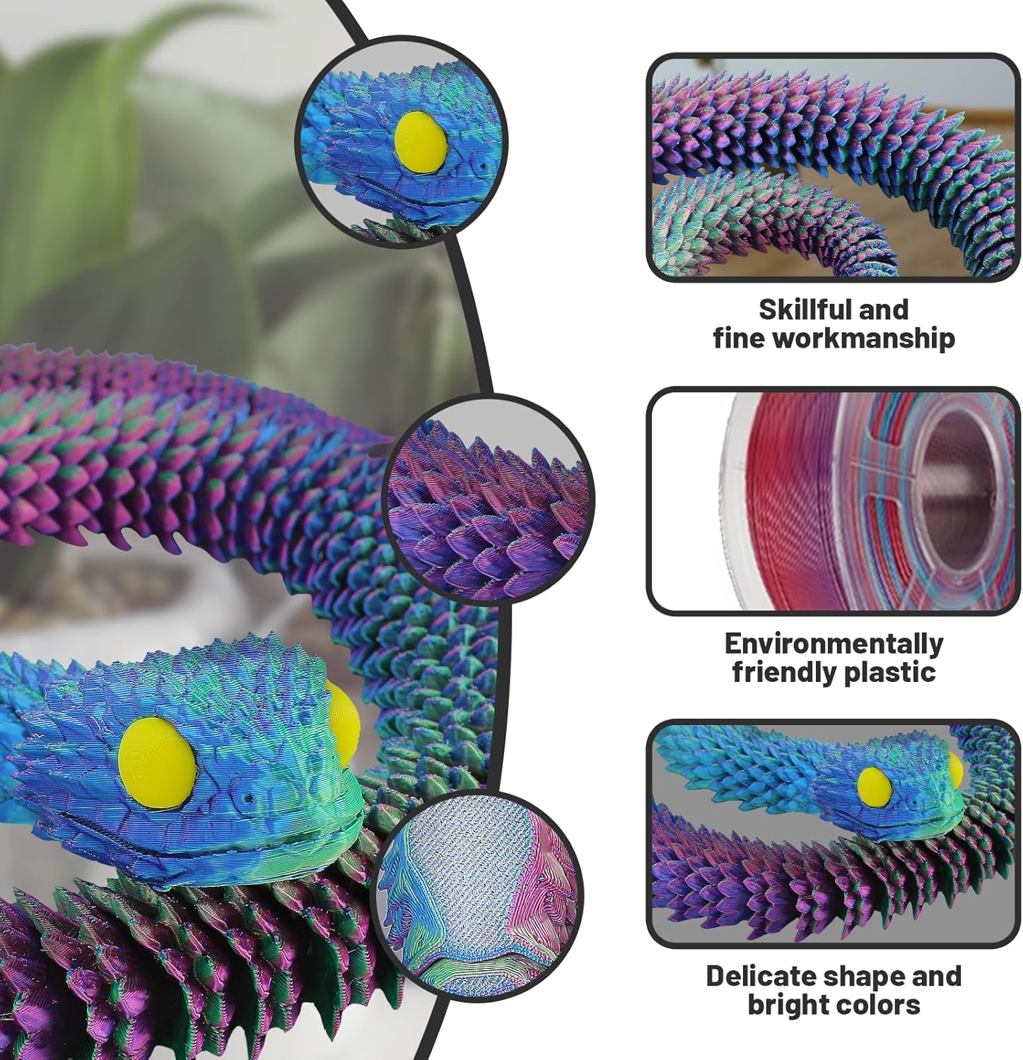- Made with 3D printing technology, these snake toys are durable, lightweight, and exhibit a smooth finish, ensuring a long-lasting product.