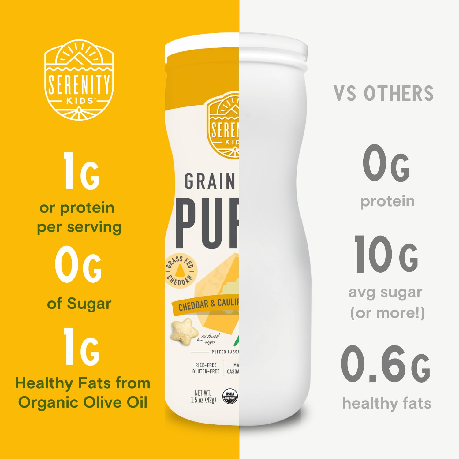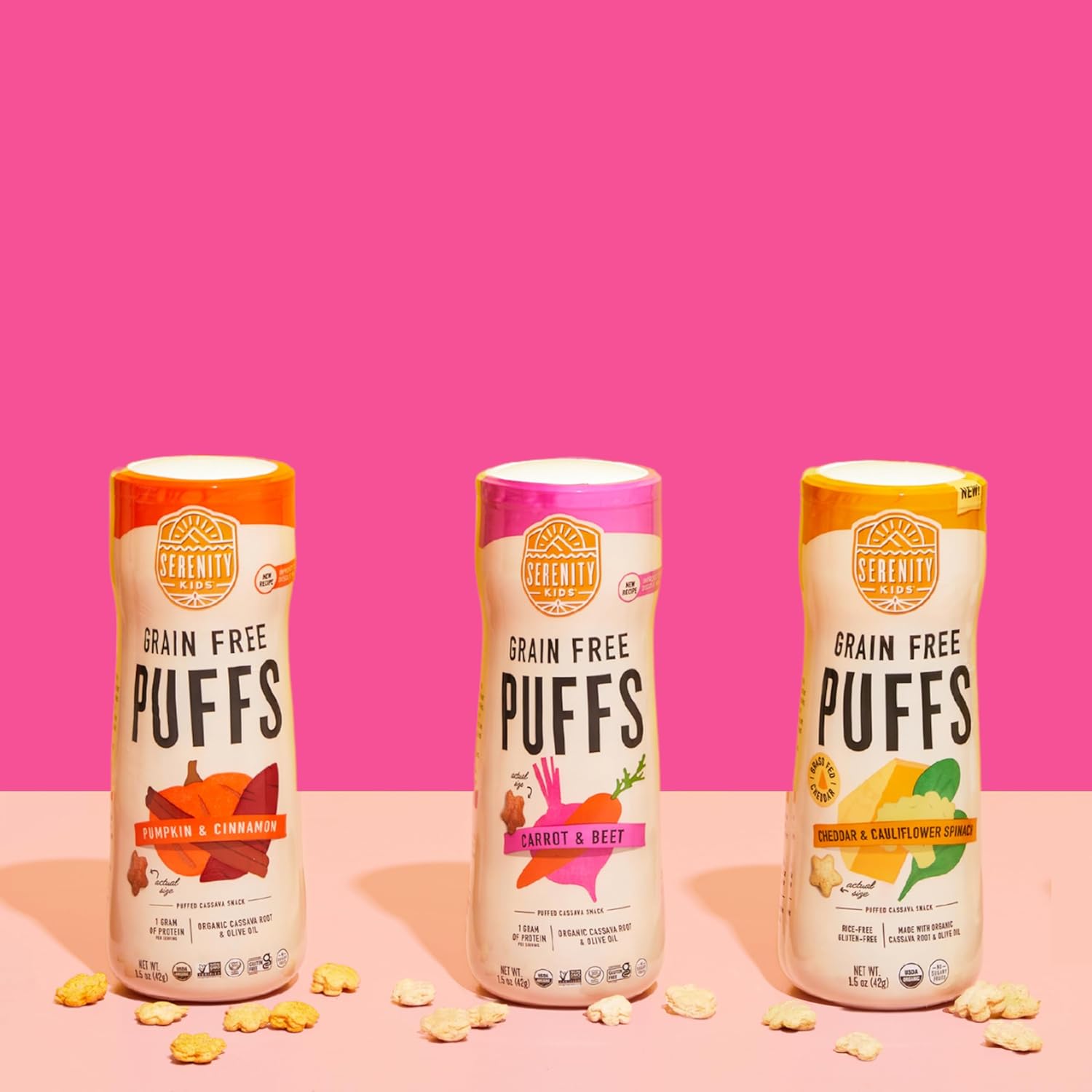 - SERENITY KIDS FUN TIME: We’re all about making snack time fun for kids and stress-free for parents with these yummy and nutritious puffs. This grain free puffs baby pack is a must-have for your baby's snack needs