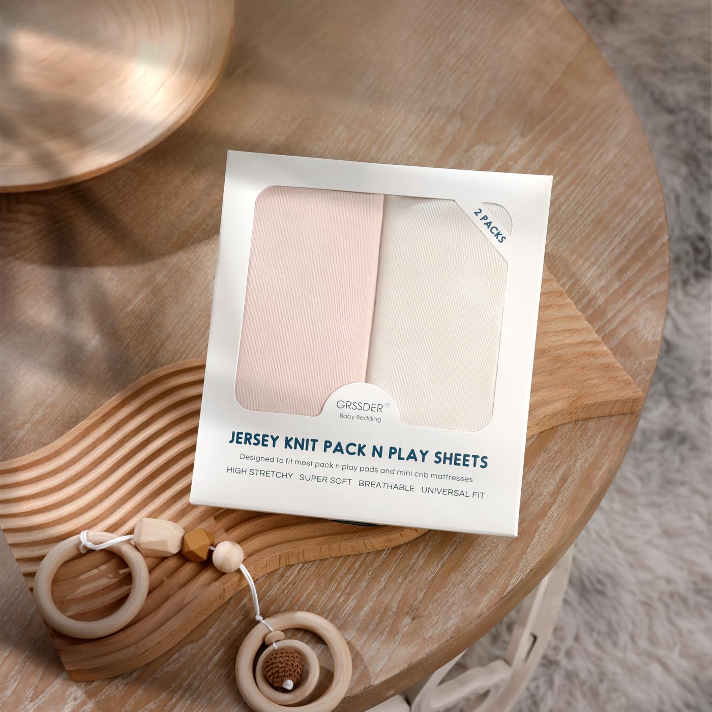 GRSSDER Mini Crib Sheets Fitted, Pack and Play Sheets 2 Pack, Ultra Soft Stretchy Pack N Play Sheets, Universal Fit for Playard Mattress, Jersey Crib Sheets for Boys and Girls, Cream/Pink