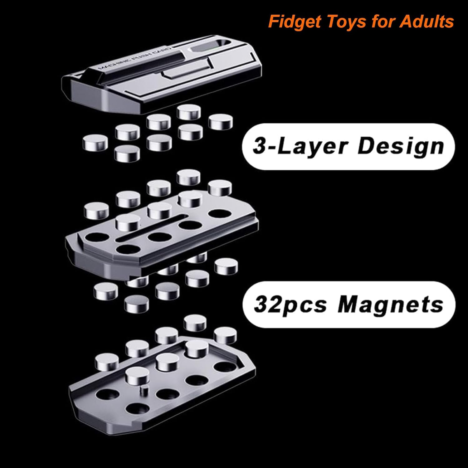 - Metal Fidget Toys Adults-This EDC metal fidget slider has good solid construction with enough magnets- -32pcs magnet sinside.Having good haptic experience,When push this cool fidget toys,the magnets and framing plate inside move around.Sliding the magnetic fidget halves back and forth has such a satisfying feel and sound,enough magnetic force can make a crisp clicking sound