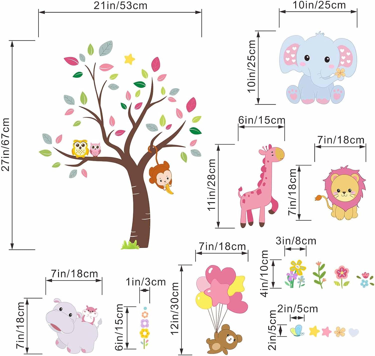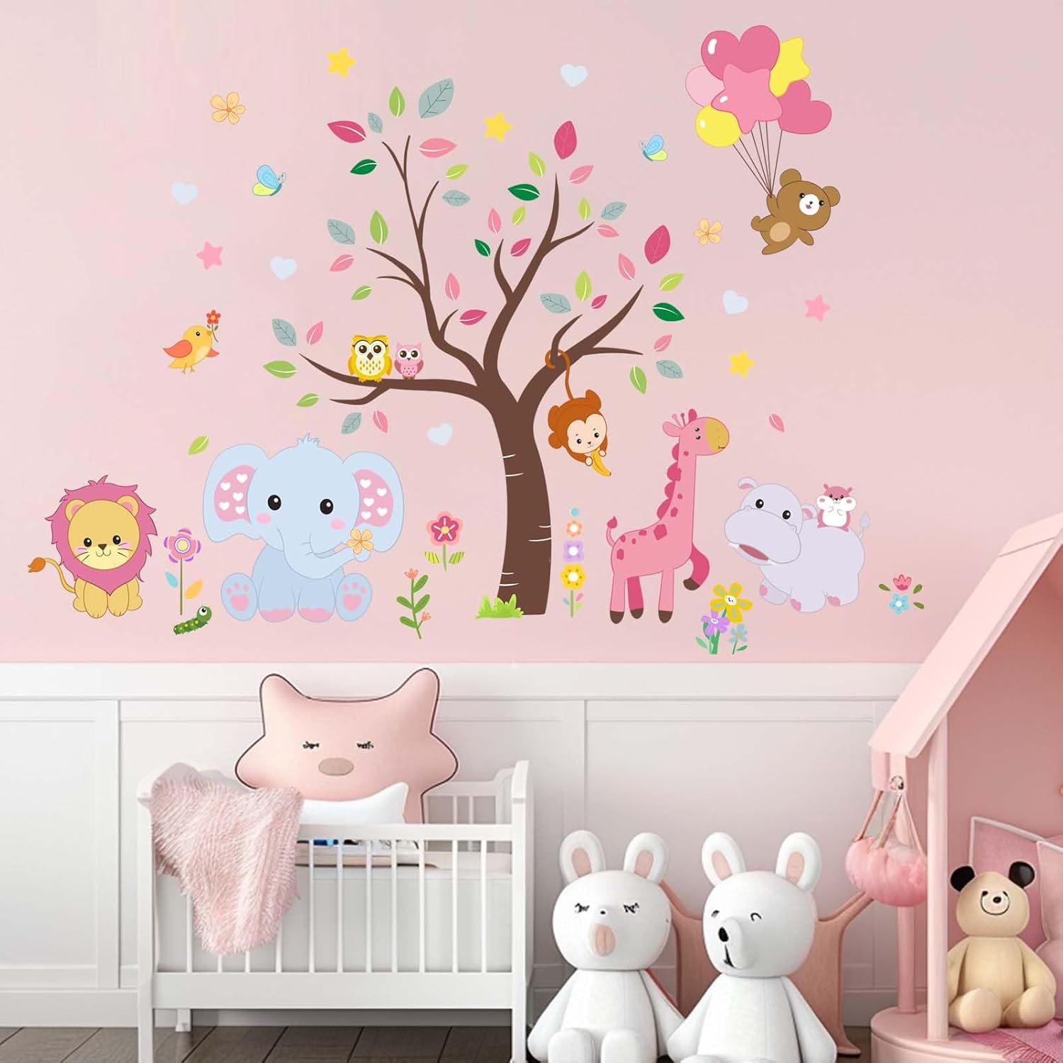 Pink Animals Baby Wall Stickers - Forest Lion Elephant Monkey Hippo Wall Decals - Girls Baby Nursery Kids Room Wall Decor