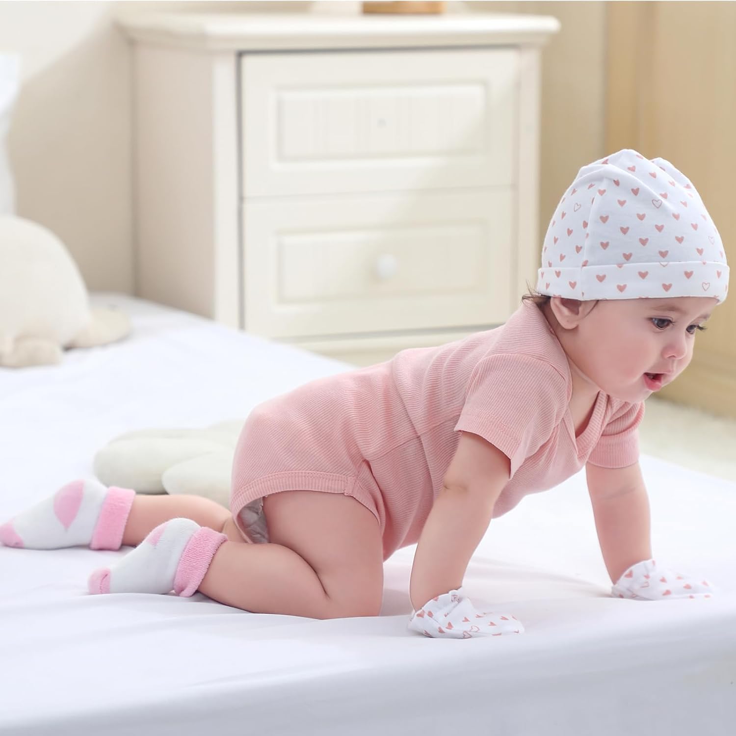 - Set Includes: 3-pack ribbed short-sleeve bodysuits, one ribbed snap-button romper, one 2-way zipper romper, 3 pairs of solid-colored pants, and 5 pairs of thick socks