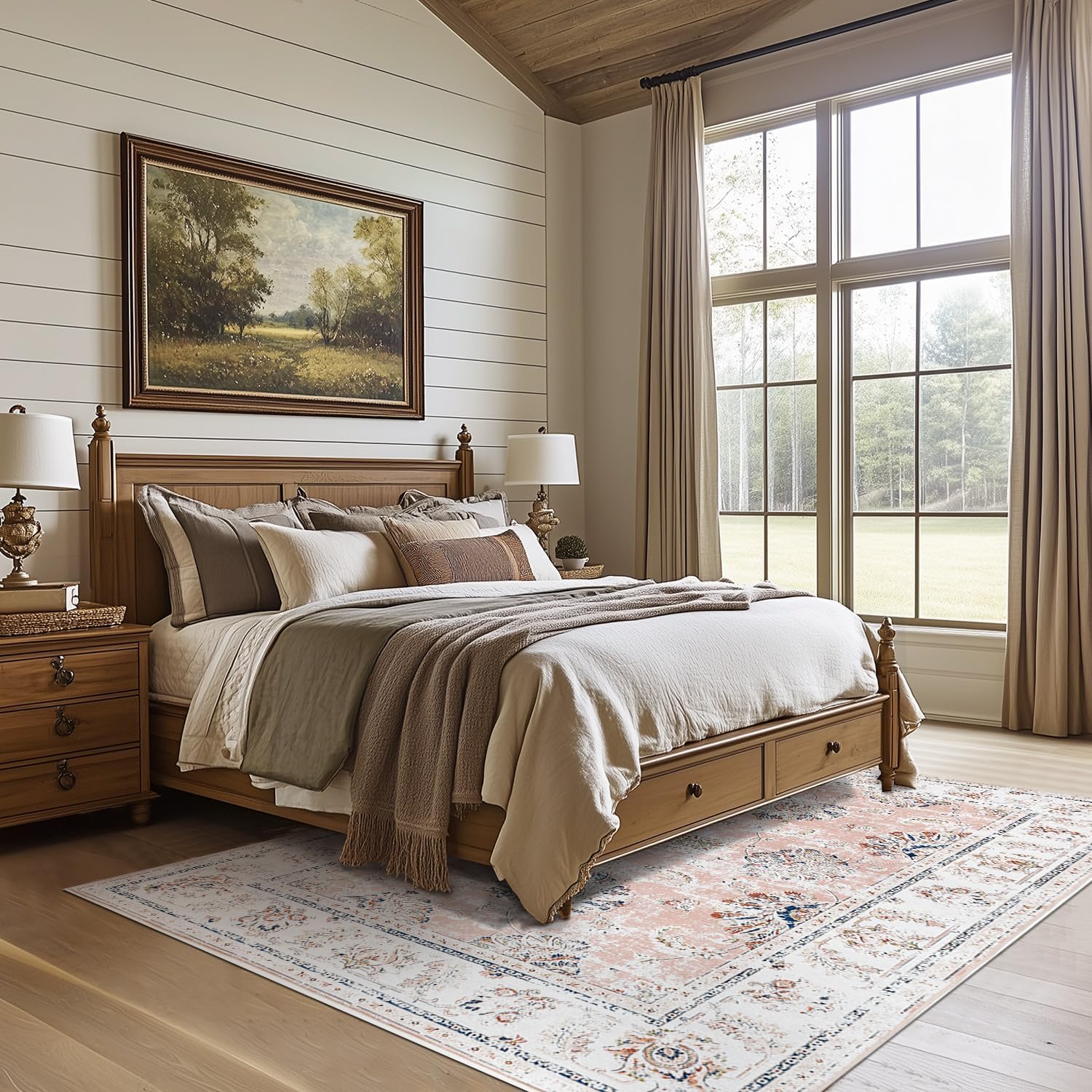 jinchan Washable Area Rug 5x7 Ultra-Thin Low Pile Non Slip Stain Resistant Soft Faux Wool Spring Floral Distressed Vintage Carpet for Bedroom,Living Room,Dining Room,Kitchen,Nursery(Pink, 5' x 7')