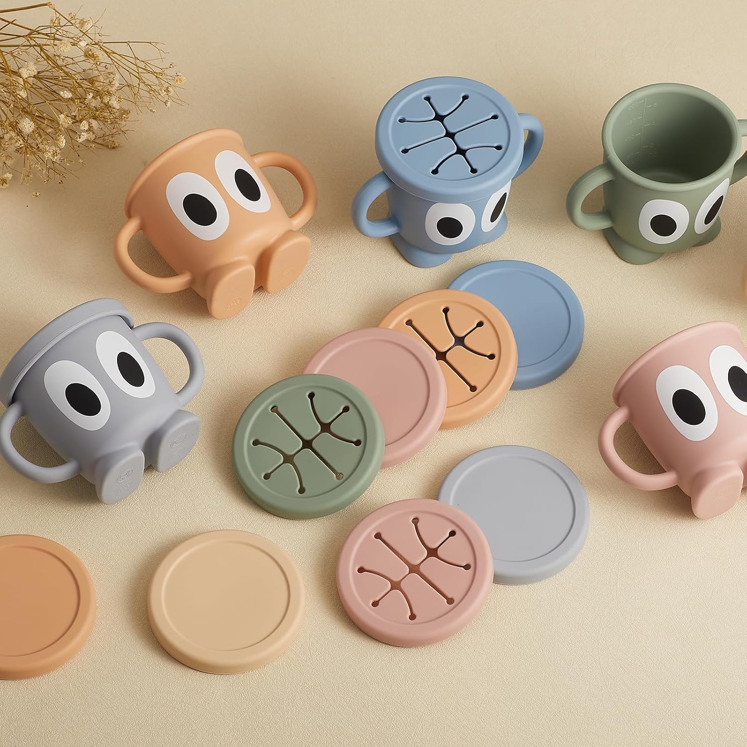 - No Spill Snack Cup - What sets our spill proof toddler cups apart is its adorable design, featuring cute big eyes and tiny feet adding a touch of charm to snack time. The soft flaps allows baby to reach inside comfortably, while also preventing food from falling out. With double handles for babies to grasp tightly, designed for small hands, so that children hold the small cups independently.