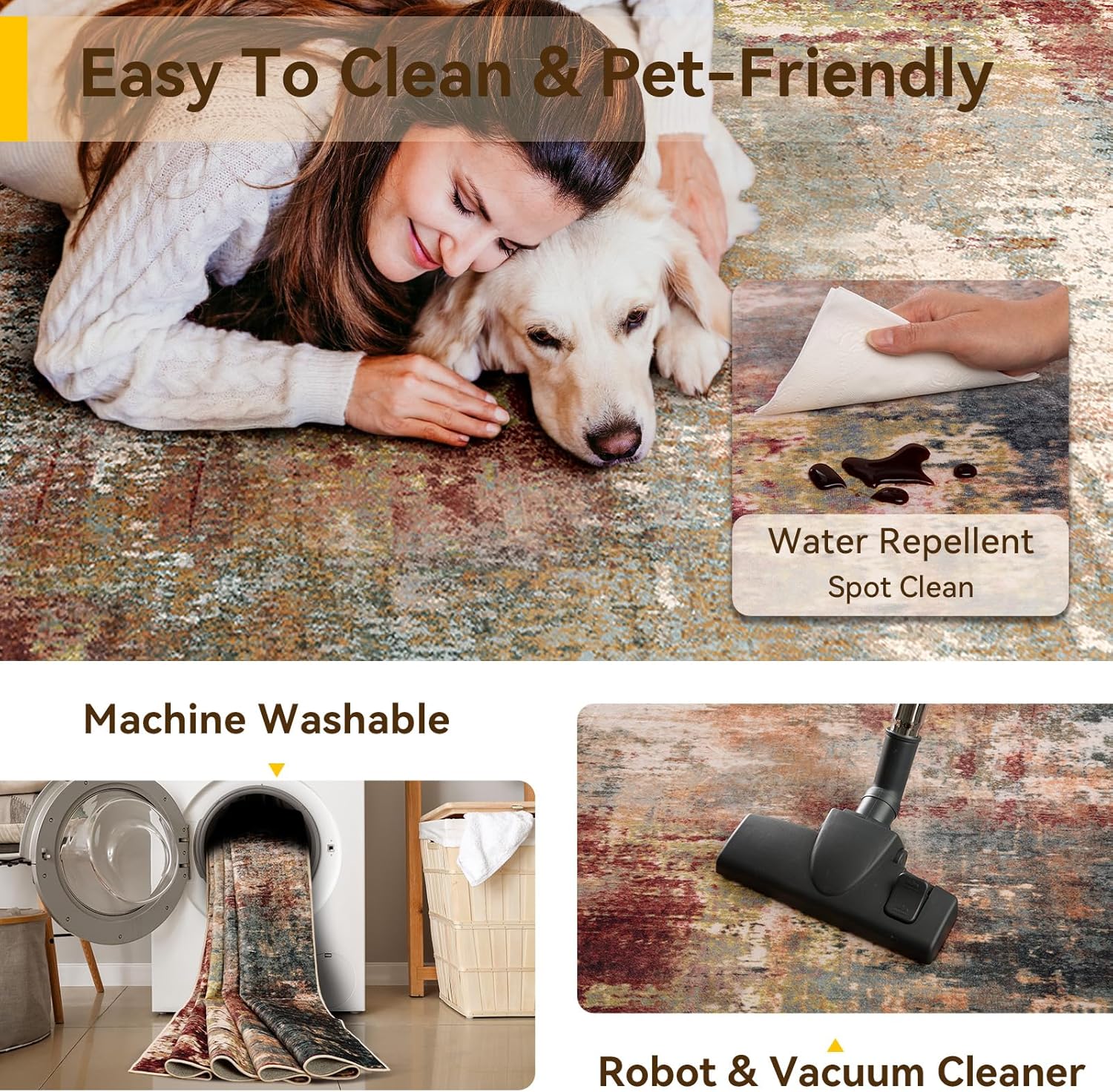 Washable Area Rugs 8'x10' Non-Slip Modern Abstract Soft for Living Room Entryway Bedroom Nursery, Print Pattern, Brown Rust Red Multi