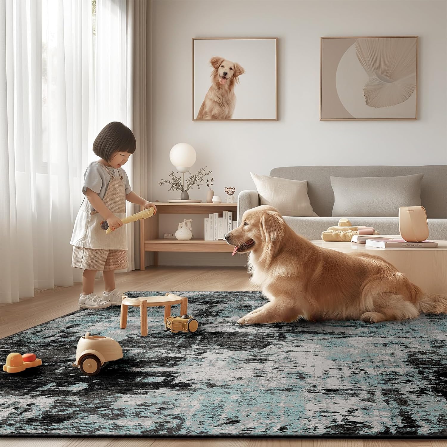 Washable Area Rugs 6ft Non-Slip Modern Abstract Soft for Living Room Entryway Bedroom Nursery, Print Pattern, Blue Black Teal