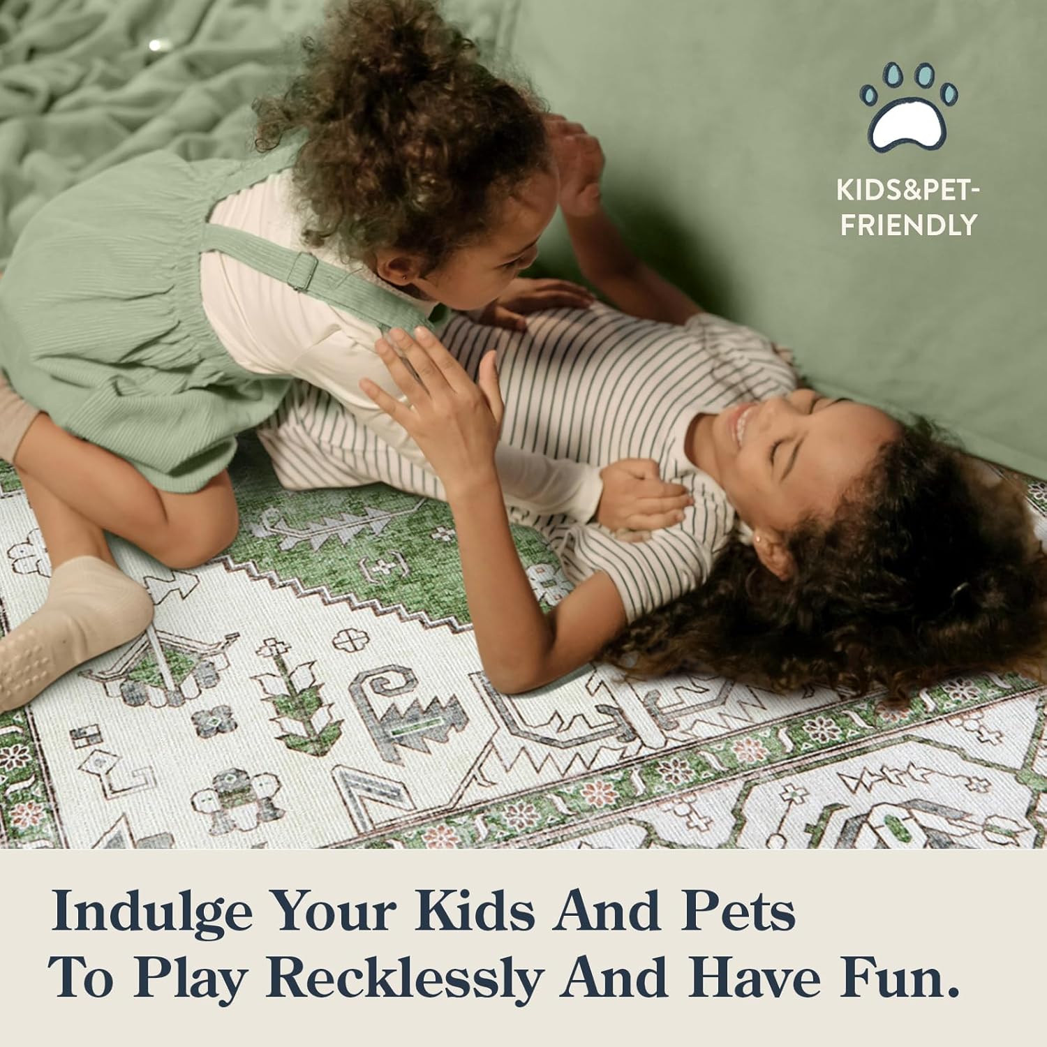 Lahome Boho Green Machine Washable Living Room Rugs - 3x5 Area Rugs for Bedroom Non-Slip Ultra-Thin Entryway Rug, Vintage Print Throw Indoor Carpet Rug for Office Kitchen (Green, 3'x5')