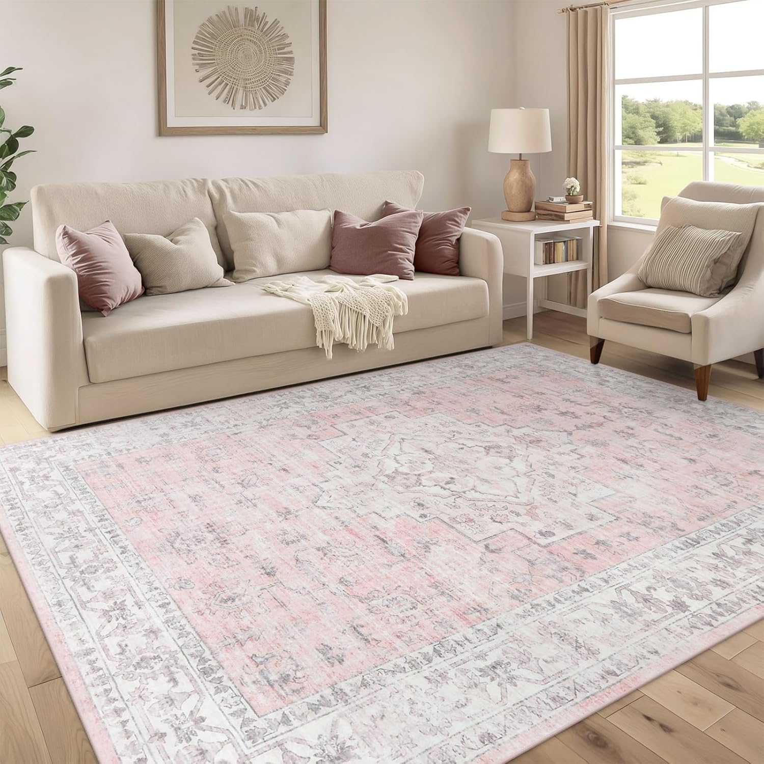 LIVEBOX Pink 6x9 Area Rug for Bedroom Girls, Boho Washable Rugs for Living Room Nursery, Non-Slip Indoor Soft Carpet Low-Pile Farmhouse Carpets for Dining Room Kids Playroom, Pink