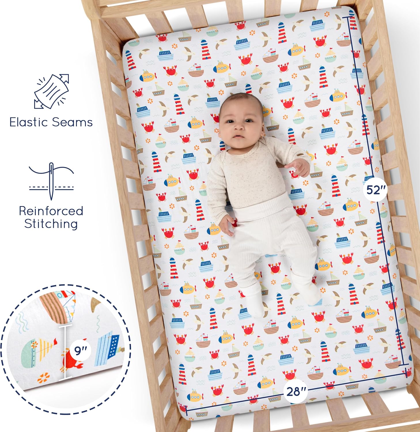 - ๐ช SOFT & DURABLE - Made from soft jersey fabric with reinforced stitching, these fitted crib sheets are built to last. Soft, breathable and safe baby boy bedding sets for cribs.
