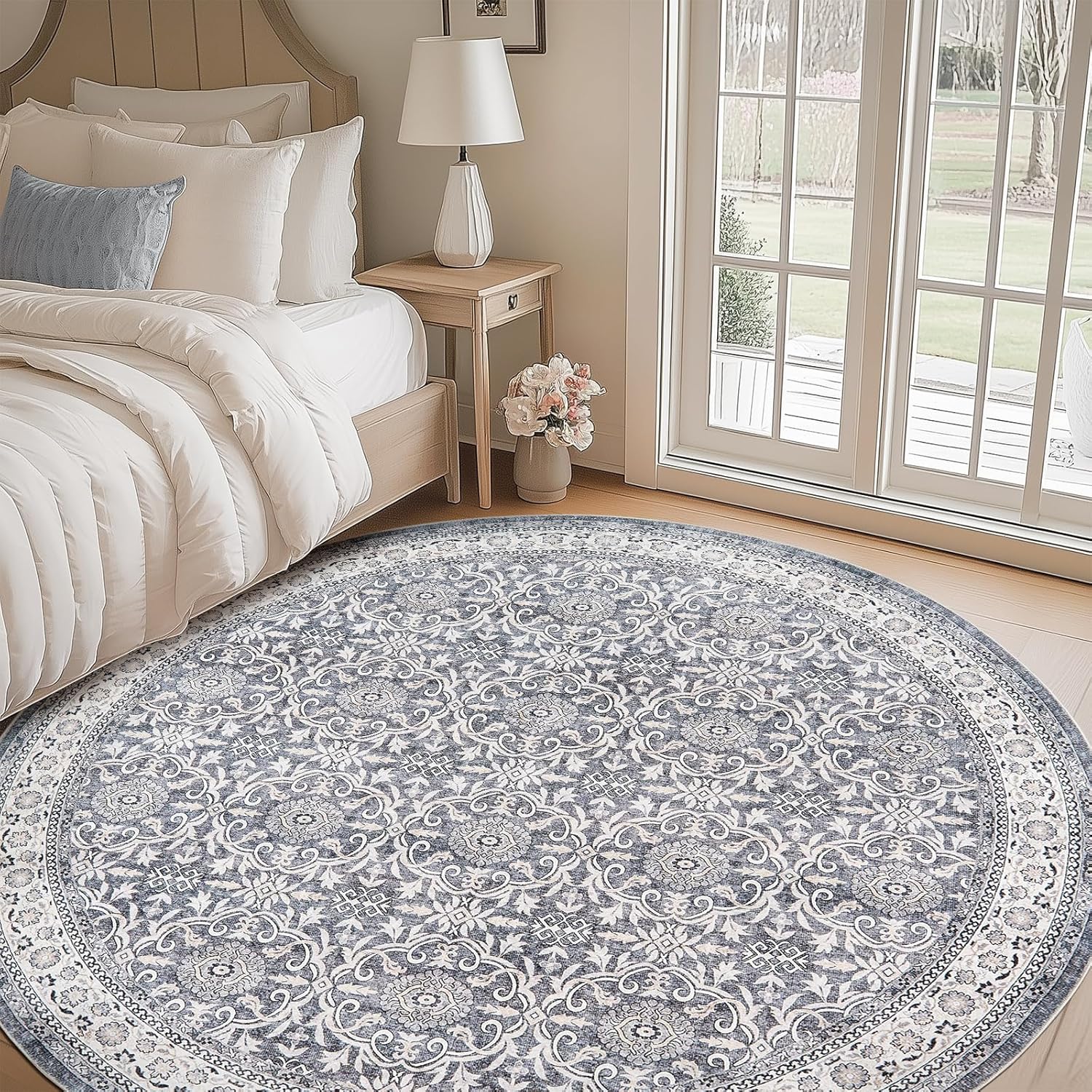 jinchan Round Rug 7ft Washable Circle Soft Rug - Low Pile Vintage 7'Round Indoor Grey Floral Print Stain Resistant Boho Carpet Ultra-Thin Non-Slip for Living Room Bedroom Dining Room Kitchen