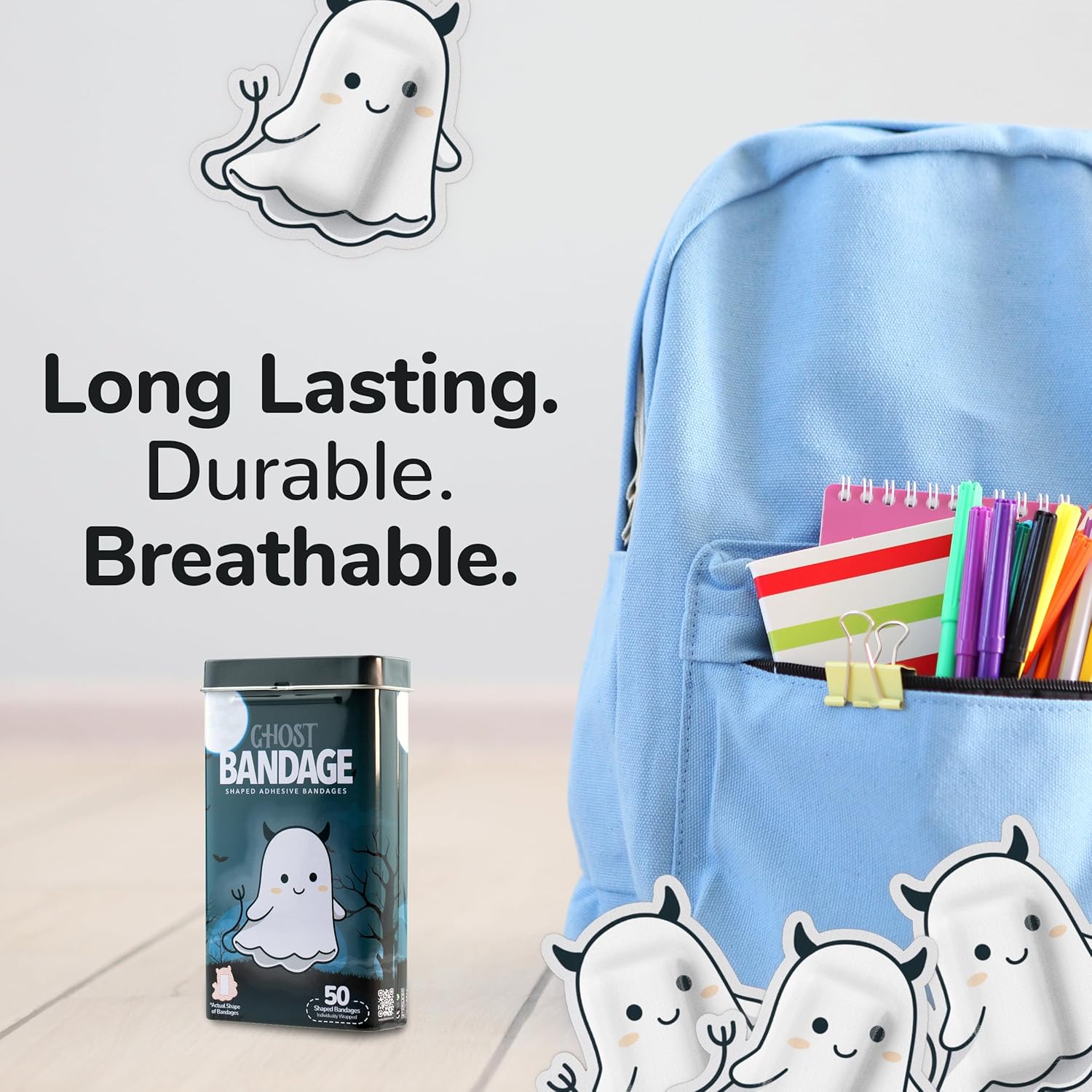 - GHOST HALLOWEEN BANDAGES: This 50 piece tin of frightfully fun Halloween Ghost bandages is great for putting a smile on kids' faces while protecting wounds such as cuts, scrapes, and burns; sticky bandages are perfect for kids and adults alike, and also for school nurses and pediatric doctors