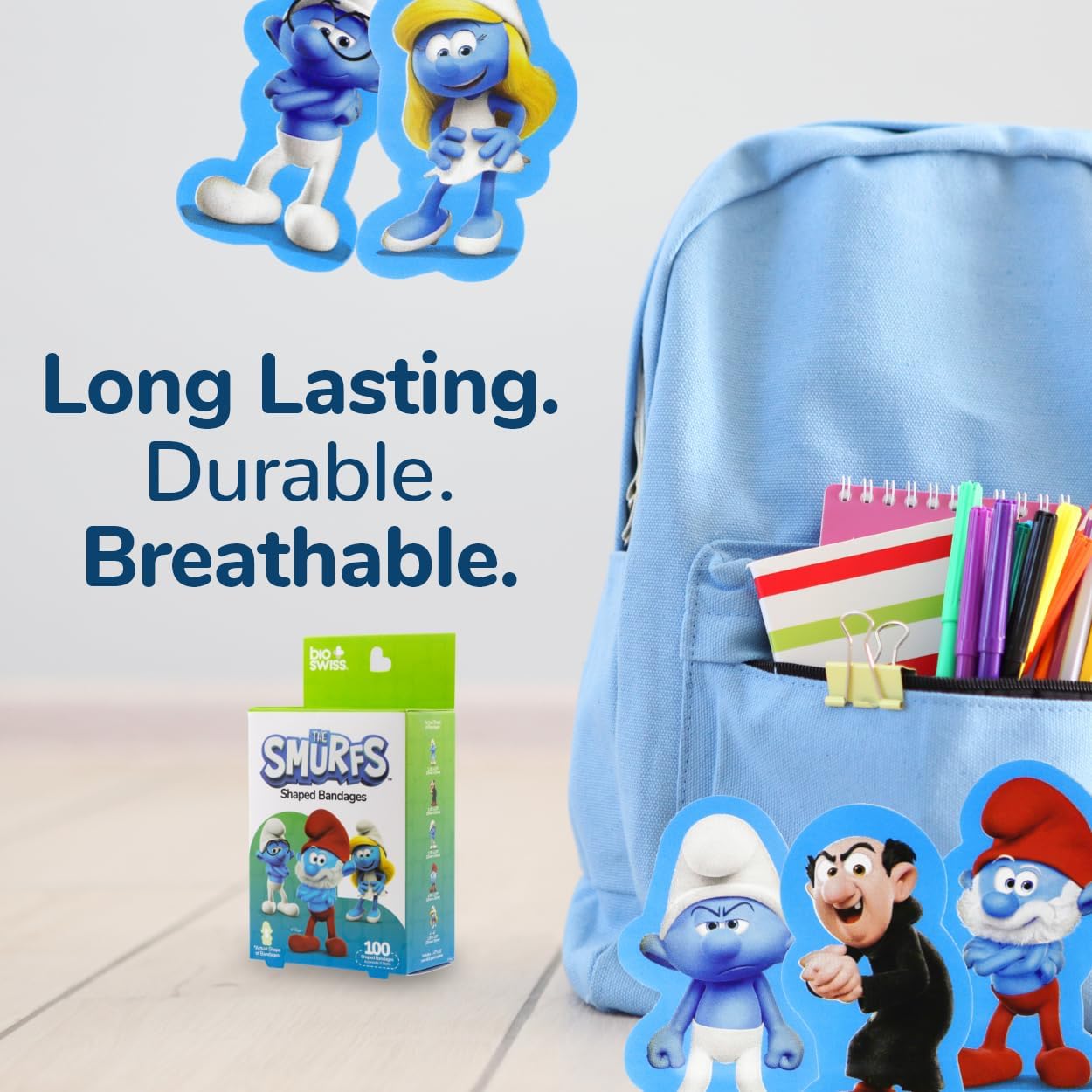 BioSwiss Bandages, The Smurfs Shaped Self Adhesive Bandage, Latex Free Sterile Wound Care, Fun First Aid Kit Supplies for Kids and Adults, 100 Count Box