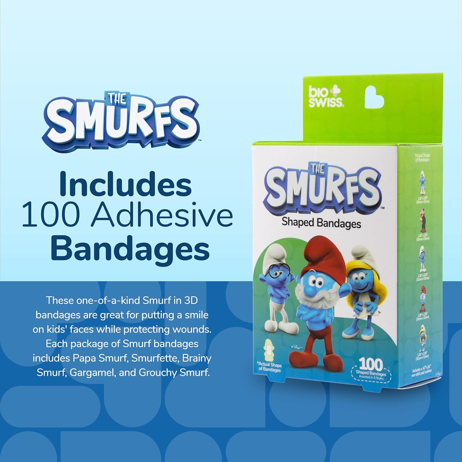 - SMURF BANDAGES: This 100 piece cardboard box of childhood classic cartoon Smurf shaped bandages is great for putting a smile on kids' faces while protecting wounds such as cuts, scrapes, and burns, and come in a variety of your favorite characters; Papa Smurf, Smurfette, Brainy Smurf, Gargamel, and Grouchy Smurf. These sticky bandages are perfect for kids and adults alike, and also for school nurses and pediatric doctors