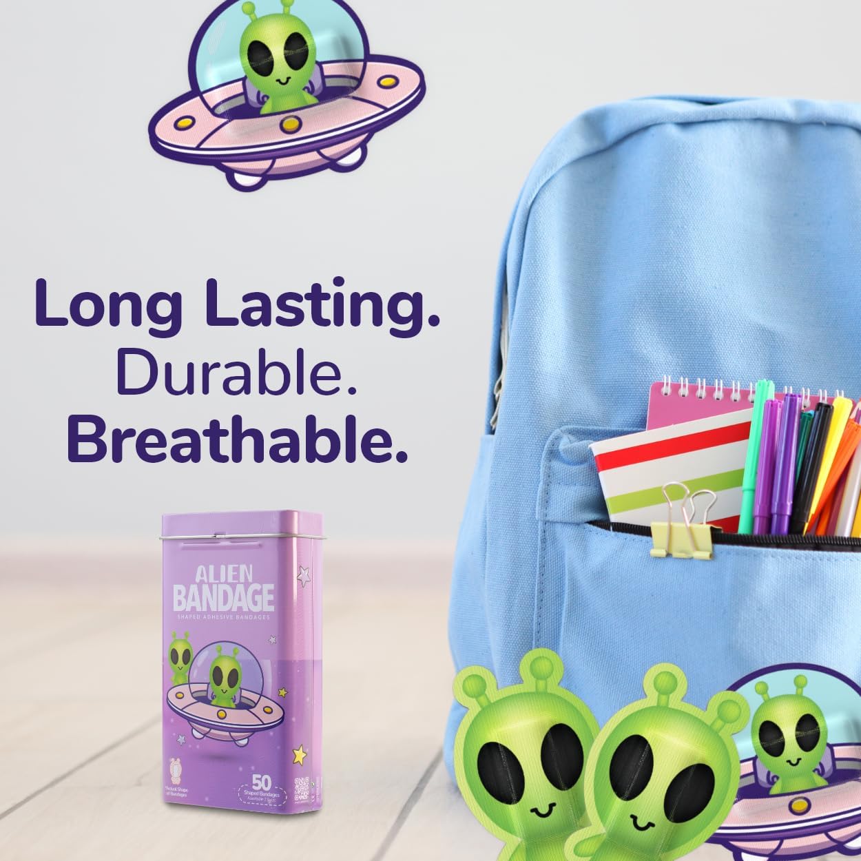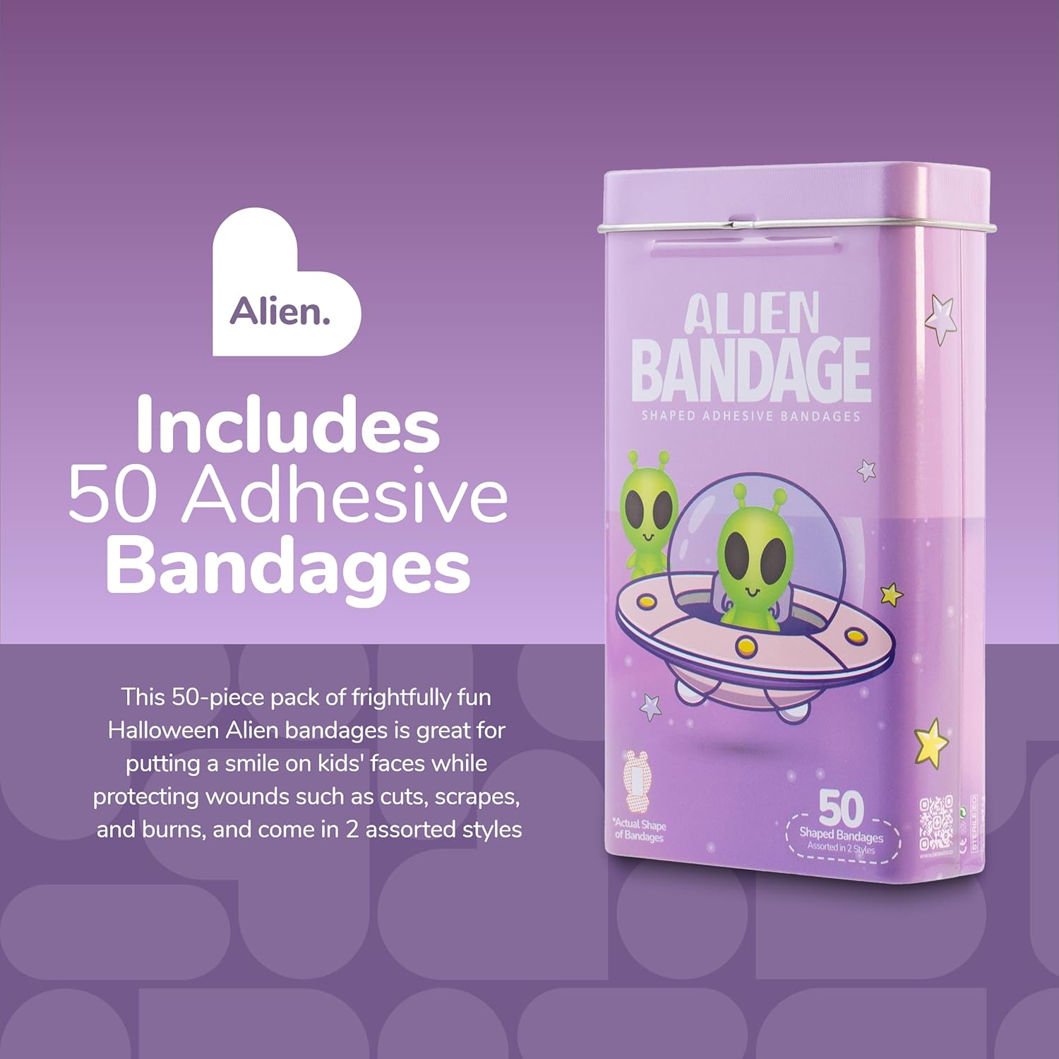 - ALIEN HALLOWEEN BANDAGES: This 50 piece tin of frightfully fun Halloween Alien bandages is great for putting a smile on kids' faces while protecting wounds such as cuts, scrapes, and burns, and come in 2 assorted styles; sticky bandages are perfect for kids and adults alike, and also for school nurses and pediatric doctors