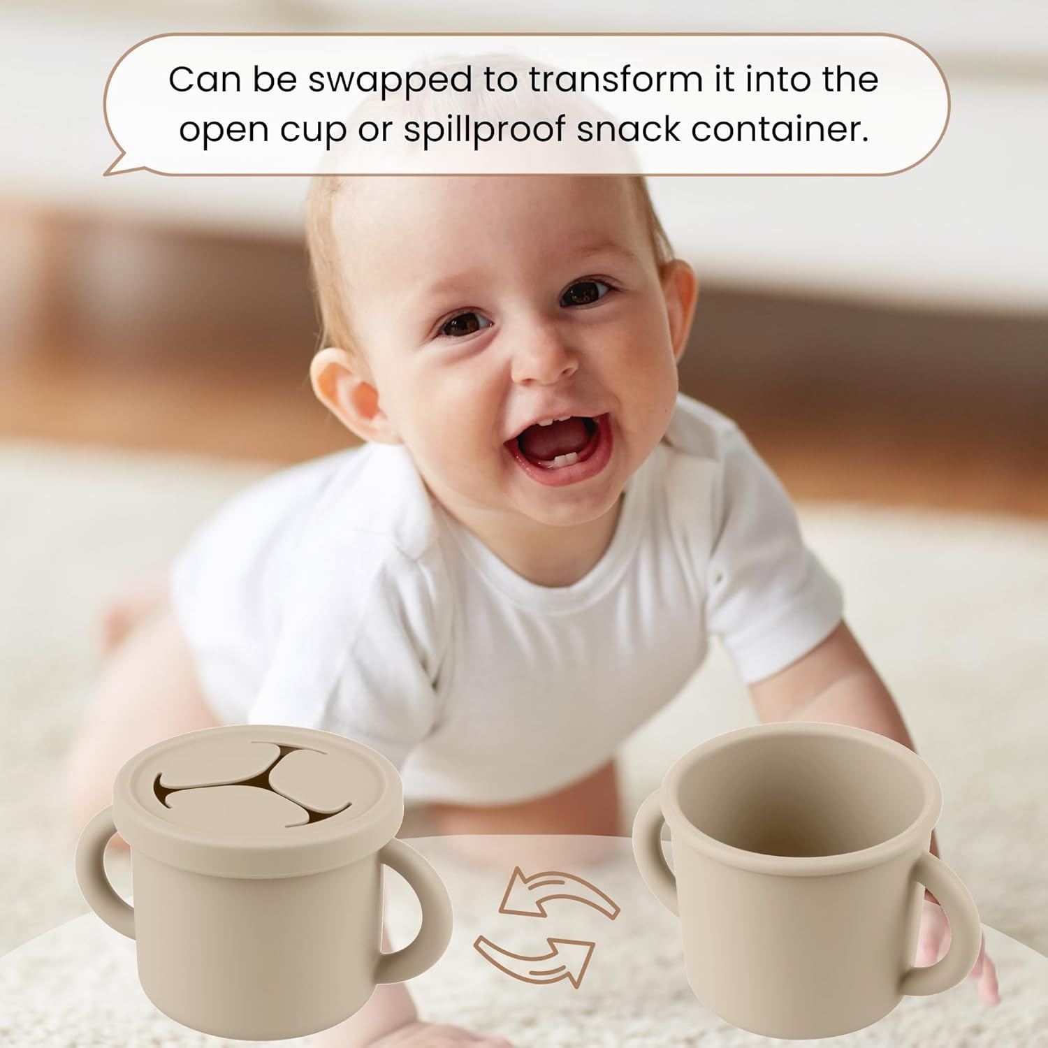 Snack Containers for Toddlers, Kids - 2 Pack Food Grade Silicone Snack Cups with Grip Handle (Sand/Natural)