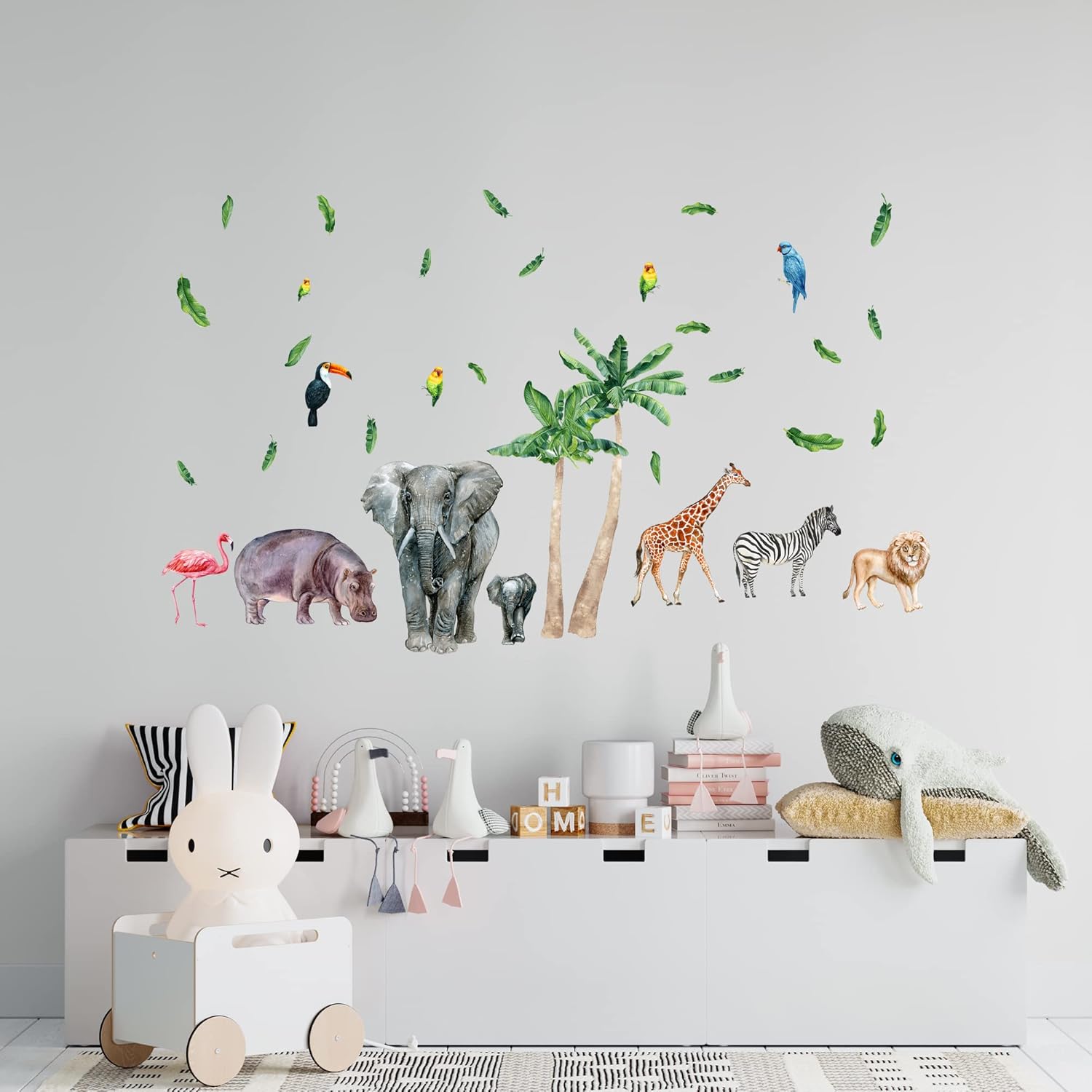 Safari Animal Wall Decals for Kids by Lipastick-Peel and Stick Jungle Stickers Giraffe, Elephant, Hippo, Palm Tree, Parrot for Toddlers Room, Nursery, Playroom, Classroom, Daycare Decor Art- S Size