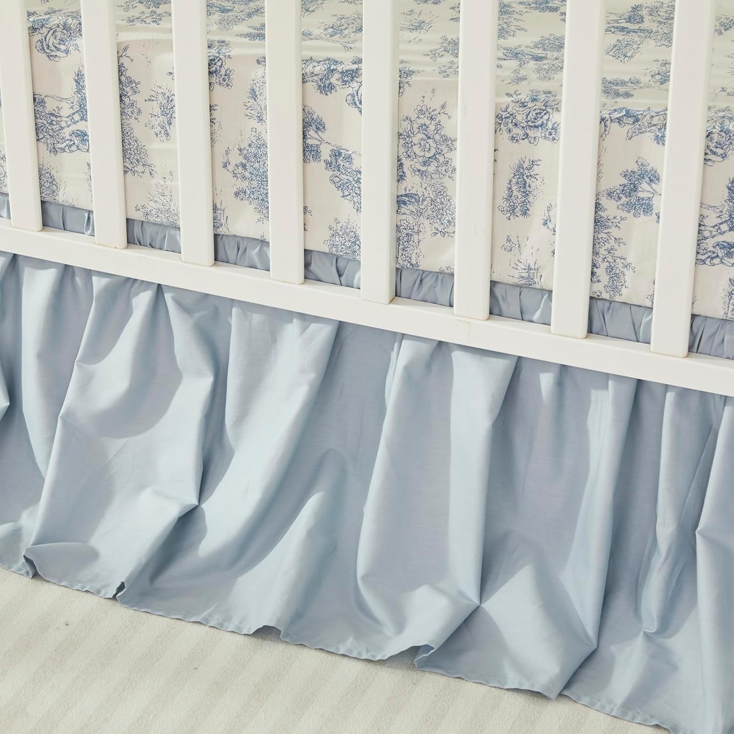 - Adding a touch of drama and style is the Solid Blue Lush Ruffles Crib Bed Skirt, which falls gracefully around the crib, completing the ensemble with an air of sophistication. Its tailored design and coordinating print ensure that every element of the bedding set works in harmony to create a serene and picturesque nursery.