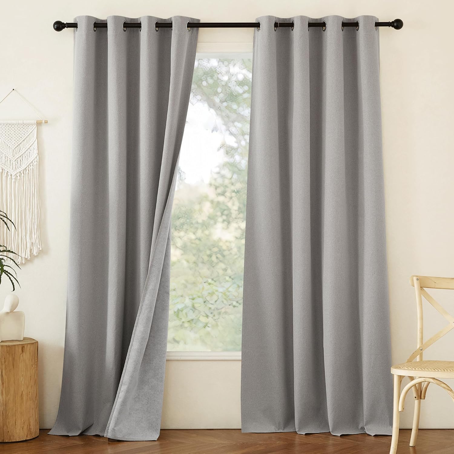 NICETOWN 100% Absolutely Blackout Faux Linen Curtains with Thermal Insulated White Liner, 52" W, 2 PCs, Light Grey, 95" Long Drapes Sweep The Floor Decorative Keep Privacy Panels for Living Room/Villa