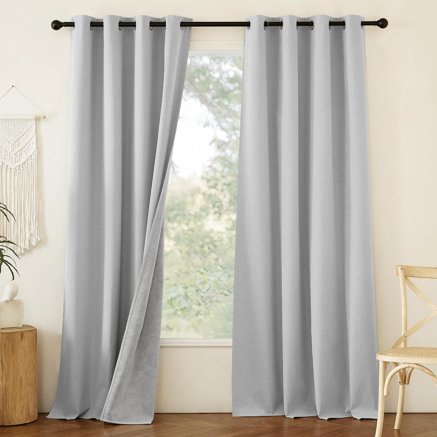 NICETOWN 100% Absolutely Blackout Faux Linen Curtains with Thermal Insulated White Liner, Greyish White, W52, 2 Pieces, Noise Reducing Faux Linen Look Curtains for Windows 95" Length for Classroom
