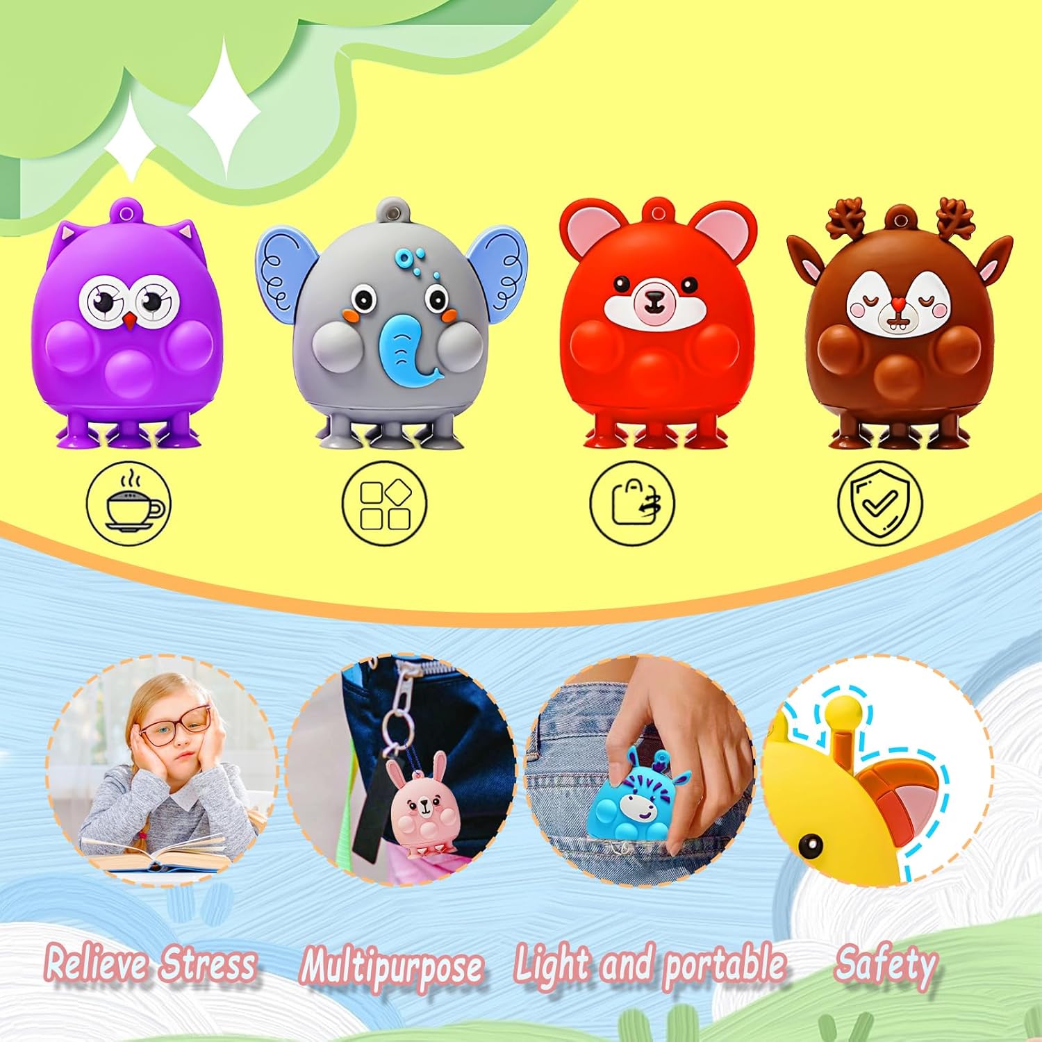 - KIDS FIDGET SUCTION TOYS: This package has some cute elephant *3, rabbit *3, penguin *3, bear *3, owl *3, giraffe *3, zebra *3, elk *3, a total of 24 well-designed styles. Squeeze the bubbles to make a "POP" sound! The bottom suction cup can be firmly attached to the glass and other places. The combination of fidget bubble toy and suction cup toy will help you unlock more new ways to play!