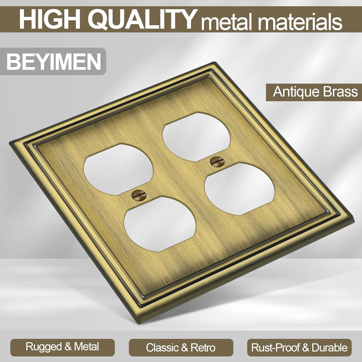 Metal Double Outlet Covers Wall Plate, Antique Brass Decorative Light Switch Plate 2 Gang Duplex Outlet Covers - Classic Style, 3 Pack