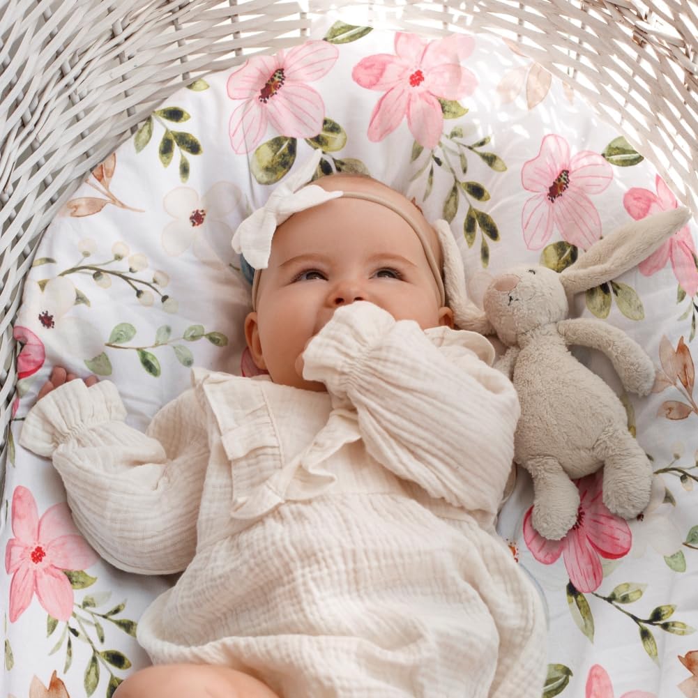 4 Pack Baby Girl Bassinet Sheets Set Soft Fitted Floral or Elephant Theme Baby Girl Mattress Covers Breathable Toddler Bed Sheets for Infant or Newborn Girls (Flower, Bassinet Sheets)