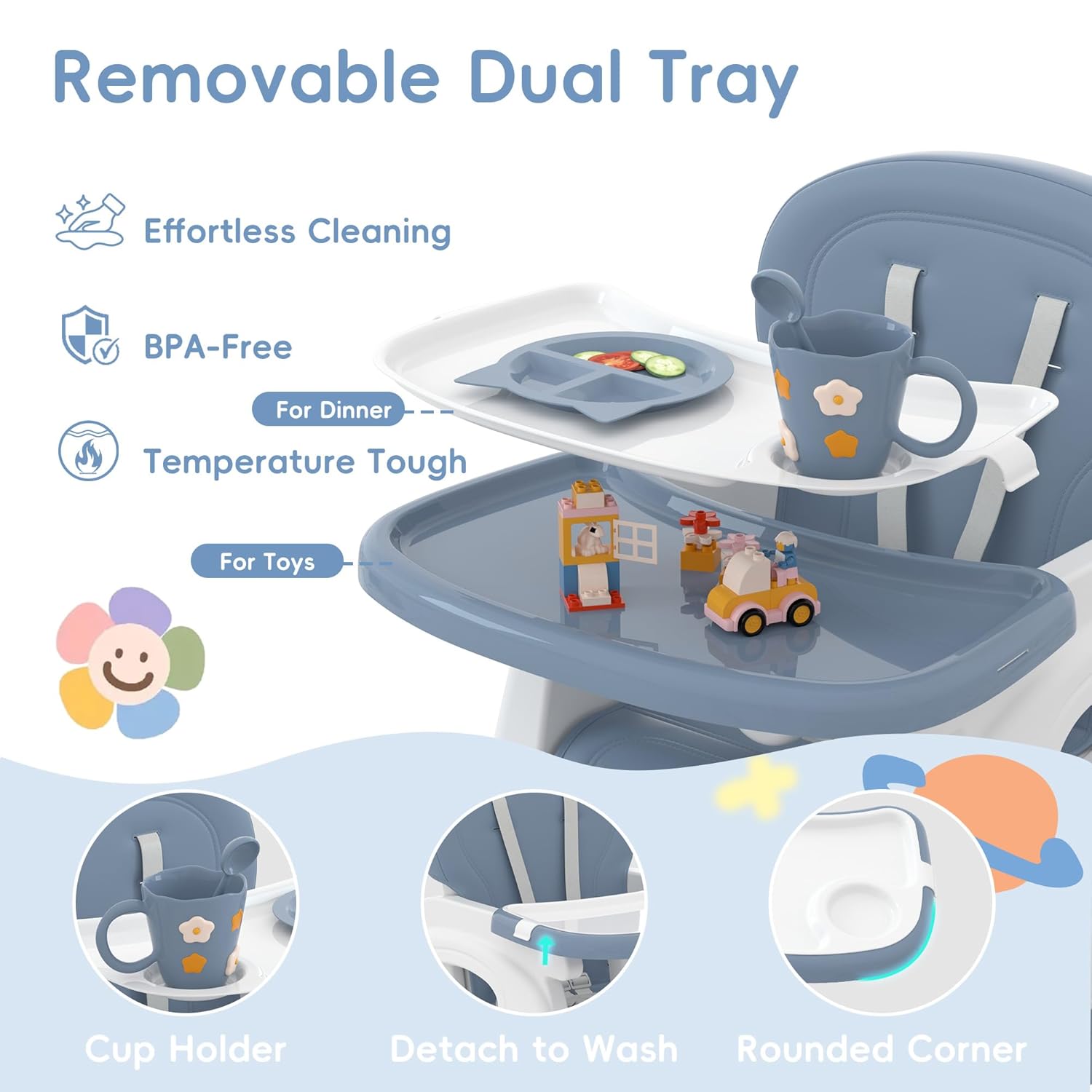- ๐ผ REMOVABLE DUAL TRAY - The baby feeding chair includes a removable double tray, perfect for meals and playtime. The top tray features a built-in cup holder, while the bottom tray provides a spacious play surface. Made from BPA-free PP material, these trays are safe for your child and easy to clean.