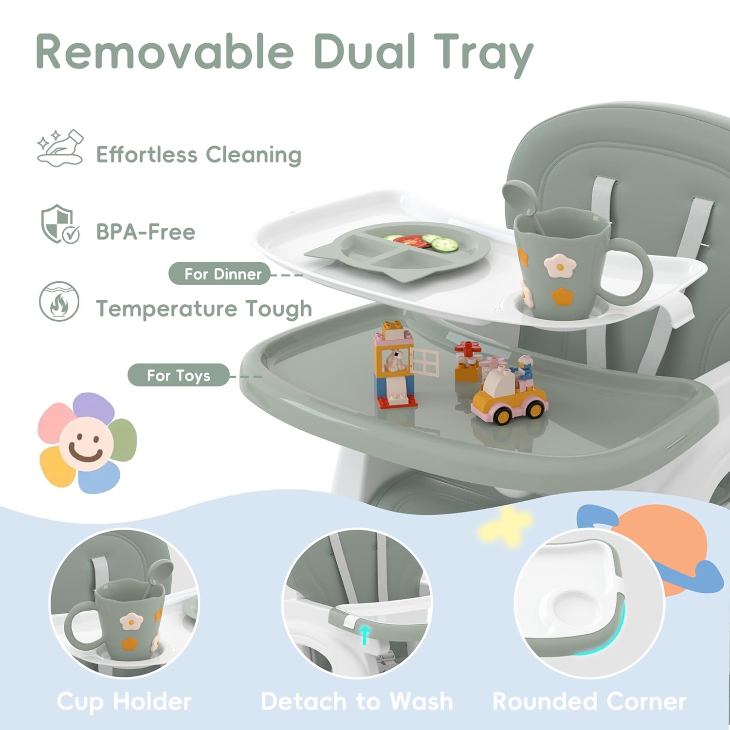 - ๐ผ REMOVABLE DUAL TRAY - The baby feeding chair includes a removable double tray, perfect for meals and playtime. The top tray features a built-in cup holder, while the bottom tray provides a spacious play surface. Made from BPA-free PP material, these trays are safe for your child and easy to clean.
