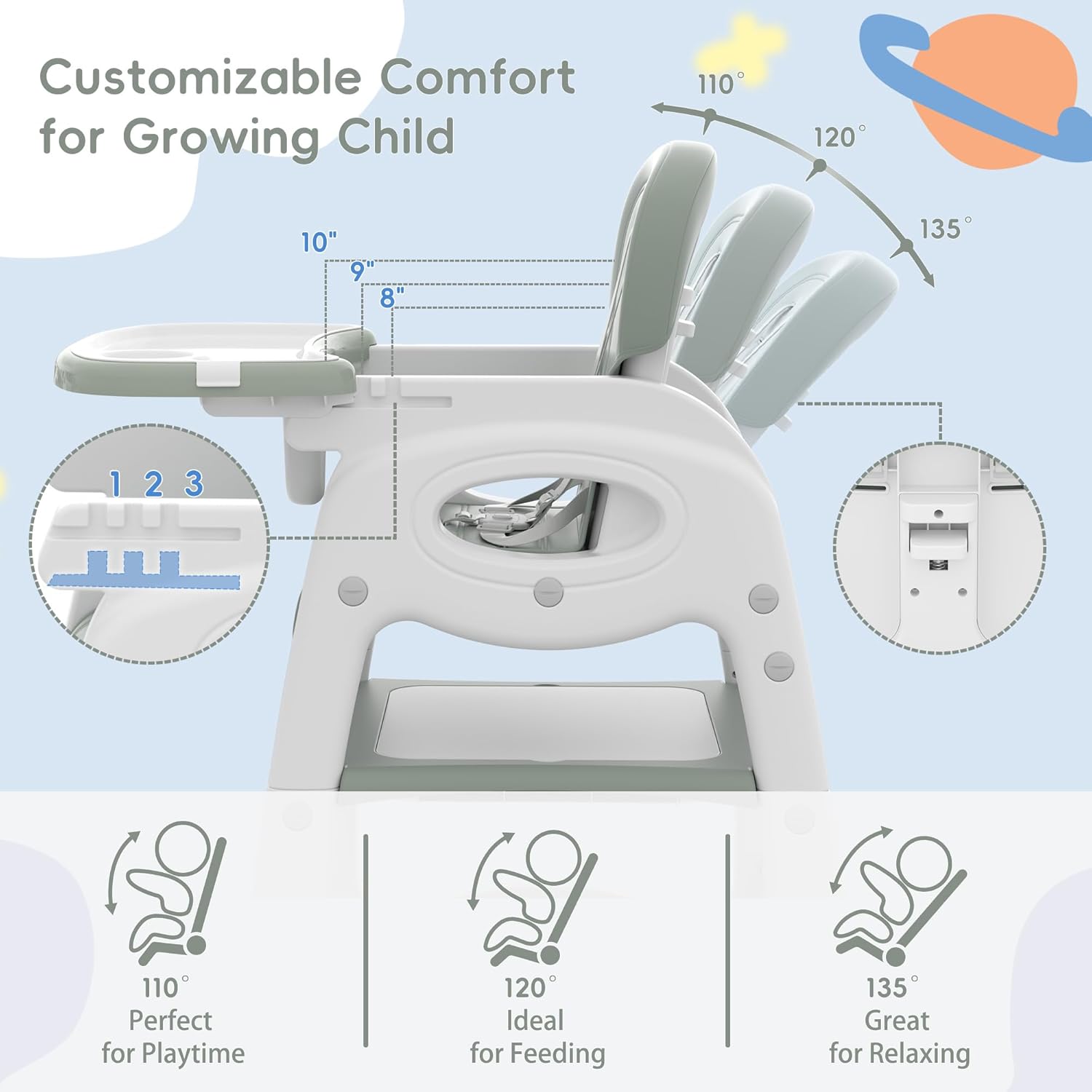 - ๐ผ ADJUSTABLE SEAT BACK & TRAY POSITIONS - Featuring a 3-position reclining backrest๏ผ110ยฐ, 120ยฐ, 135ยฐ๏ผ, this baby food chair offers customized comfort for different activities. The tray adjusts to three positions, providing ample space as your child grows. The soft, skin-friendly PU seat cushion is removable and easy to clean.