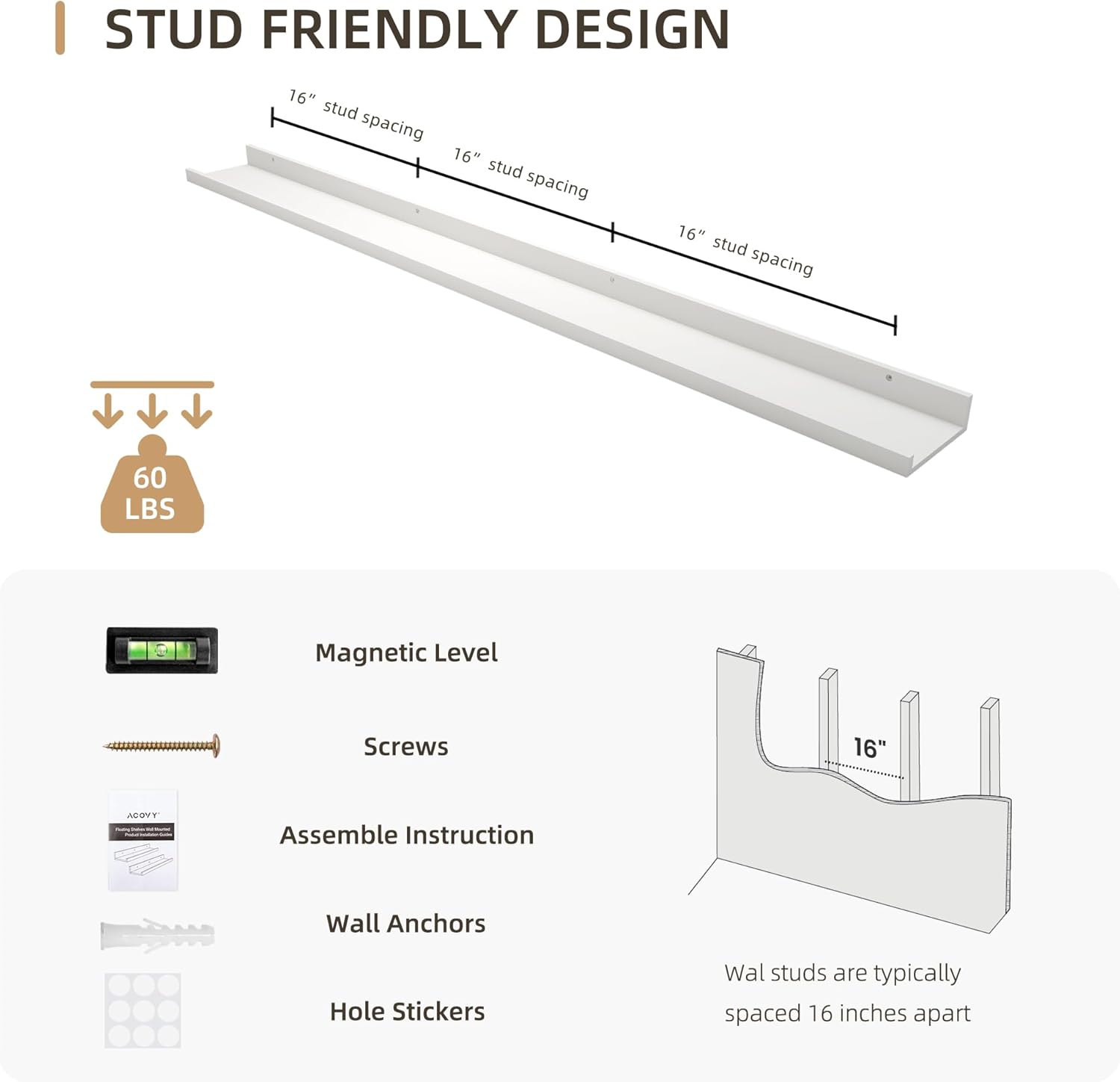 - 【Superior Quality】 Crafted from high-quality wood, each floating shelf is designed for long-lasting durability. The pre-drilled mounting holes are spaced 16 inches apart, ensuring a secure installation into wall studs.