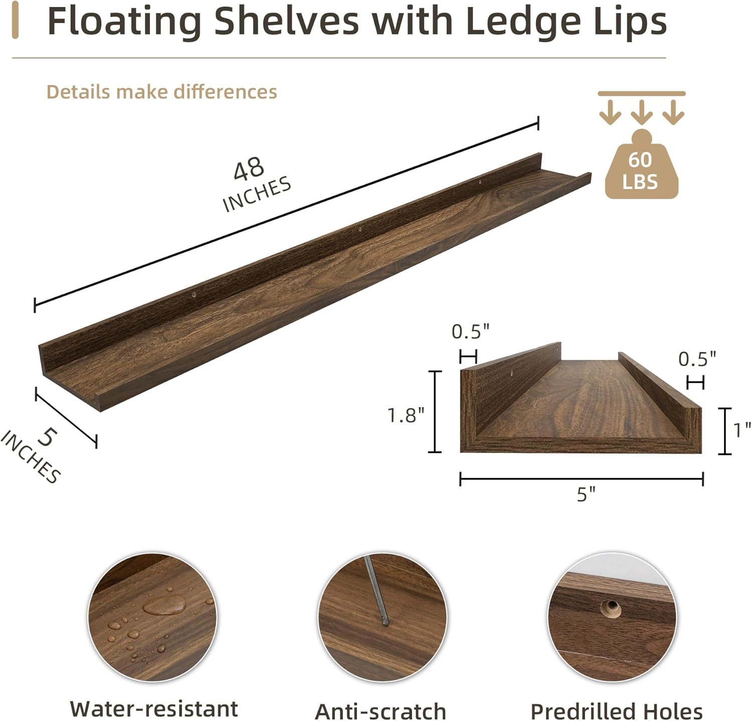 Picture Ledge Shelf, Wood Long Floating Shelves for Wall, Set of 2, 48 inch Picture Ledge Shelves, Photo Ledge Nursery Book Shelves Wall Mounted for Living Room Kids' Room Bedroom, Color Walnut