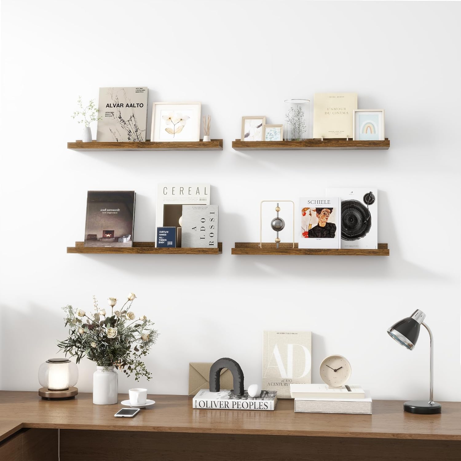 Picture Ledge Shelf, Wood Floating Shelves Set of 4, 24 inch Picture Ledge Shelves, Photo Ledge Nursery Book Shelves Wall Mounted for Living Room Kids' Room Bedroom, Color Walnut