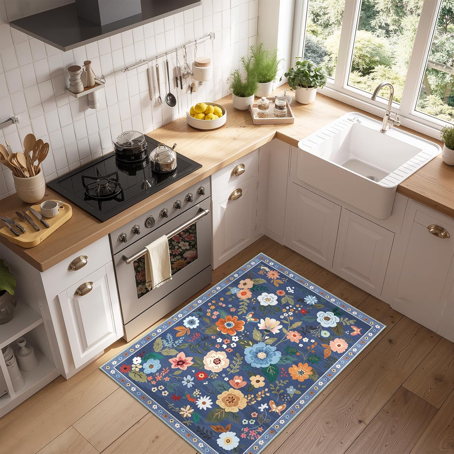 Floral 2x3 Area Rug Machine Washable Soft Print Boho Carpet Non Slip Doormat Low Pile Flower Area Rugs for Living Room Bedroom Nursery Kitchen Dining Room Indoor-Blue/Grey
