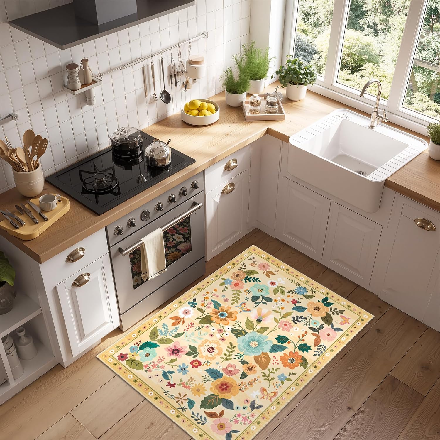 Floral 2x3 Area Rug Machine Washable Soft Print Boho Carpet Non Slip Doormat Low Pile Flower Area Rugs for Living Room Bedroom Nursery Kitchen Dining Room Indoor-Ivory/Yellow