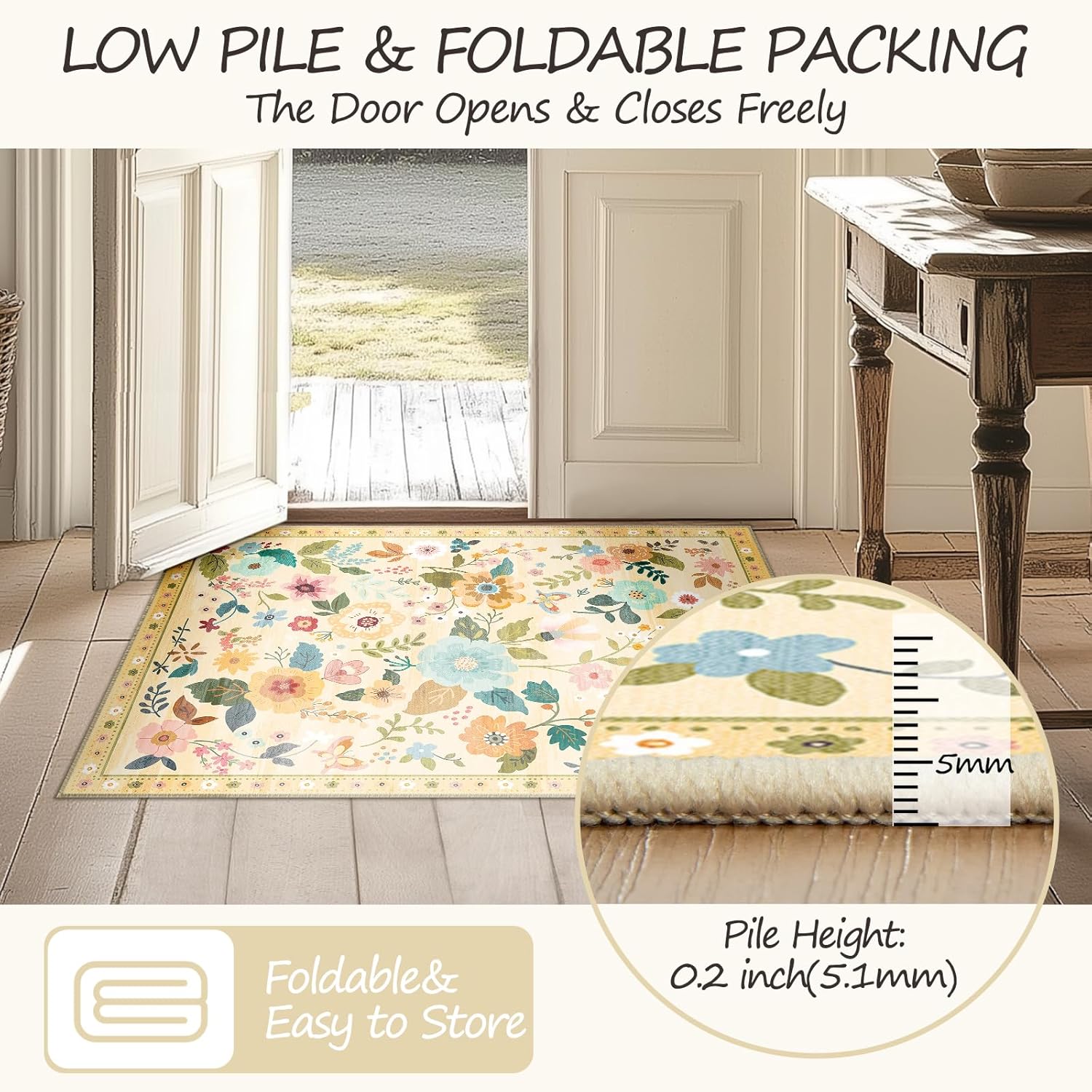 Floral 2x6 Area Rug Machine Washable Soft Print Boho Carpet Non Slip Doormat Low Pile Flower Area Rugs for Living Room Bedroom Nursery Kitchen Dining Room Indoor-Ivory/Yellow