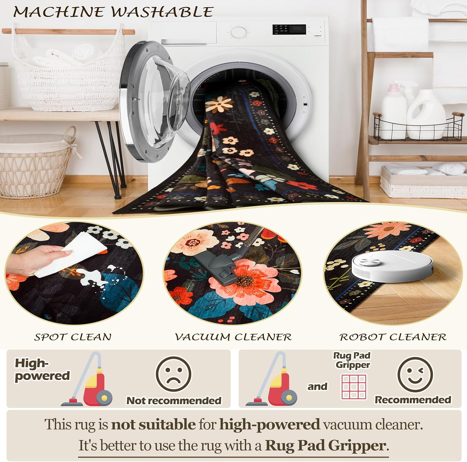 - Machine Washable:The runner rugs are machine washable,allowing for both machine wash and hand wash options.It is recommended to wash them in cold water.This floral rug is crafted with a low pile that won’t block opening and closing doors, make machine wash possible. Small stains can be blotted with a rag,soft-bristled brush,vacuum,or robotic vacuum cleaner.Avoid using bleach and high-temperature ironing