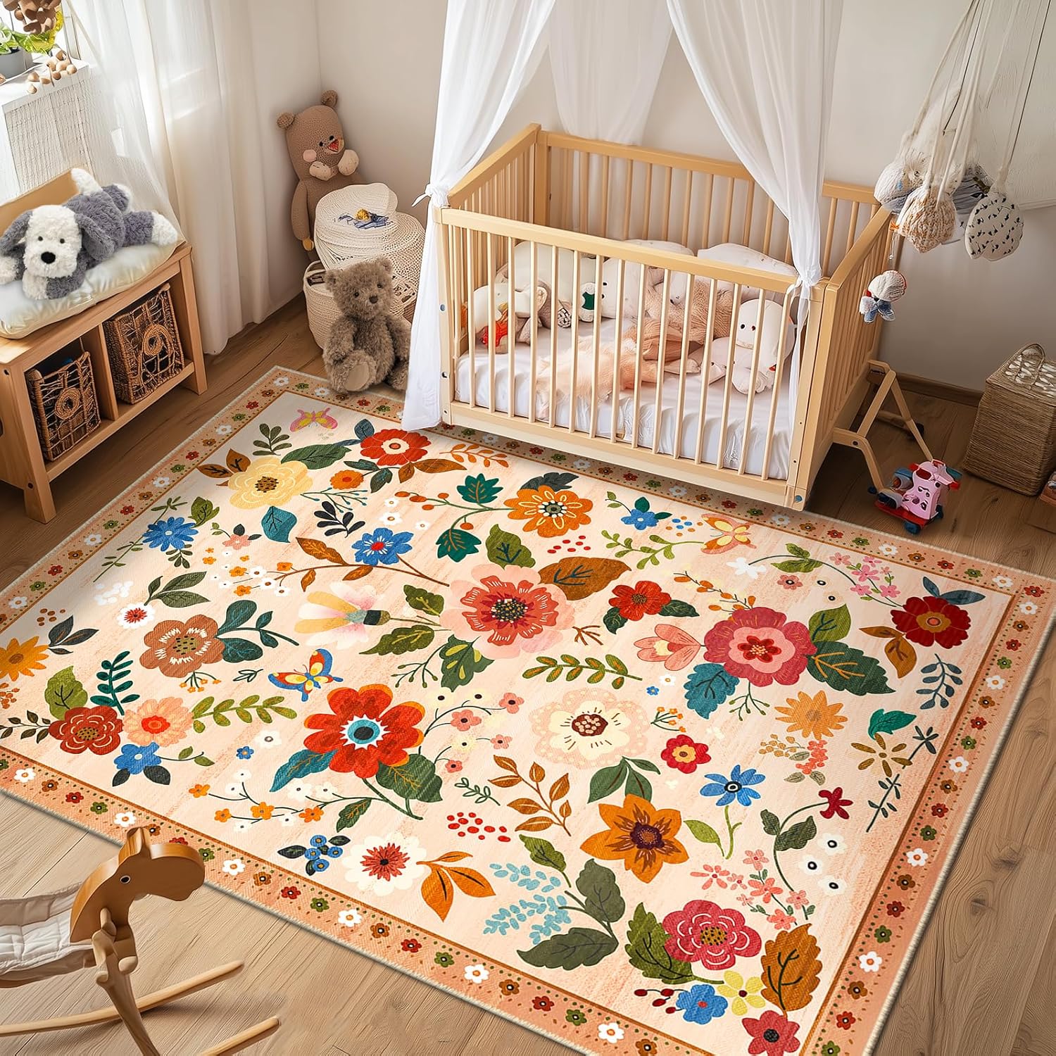 Floral 5x7 Area Rug Machine Washable Soft Print Boho Carpet Non Slip Doormat Low Pile Flower Area Rugs for Living Room Bedroom Nursery Kitchen Dining Room Indoor-Light Orange