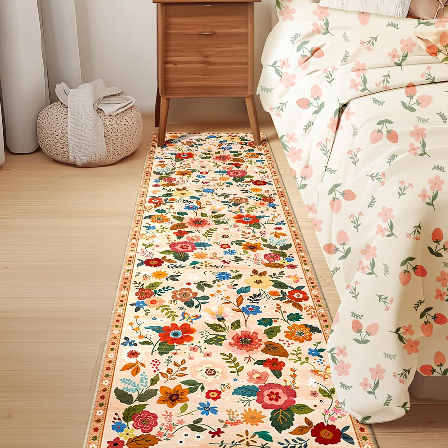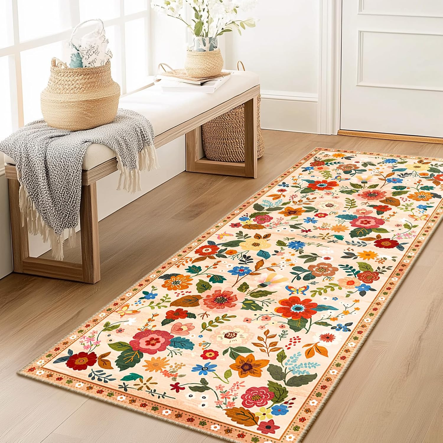 - Machine Washable:The runner rugs are machine washable,allowing for both machine wash and hand wash options.It is recommended to wash them in cold water.This floral rug is crafted with a low pile that won’t block opening and closing doors, make machine wash possible. Small stains can be blotted with a rag,soft-bristled brush,vacuum,or robotic vacuum cleaner.Avoid using bleach and high-temperature ironing