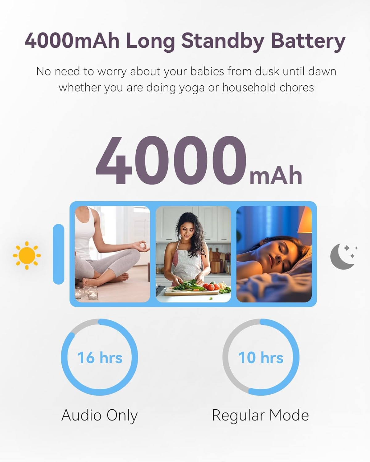 - 【Up to 10 Hrs. Regular mode or 16 Hrs Vox mode on Single Charge】: With 4000mAh rechargeable battery you can get up to 10 hours of video streaming or up to 16 Hrs of Audio only, allowing you to easily monitor your baby throughout the night or full day on one charge.