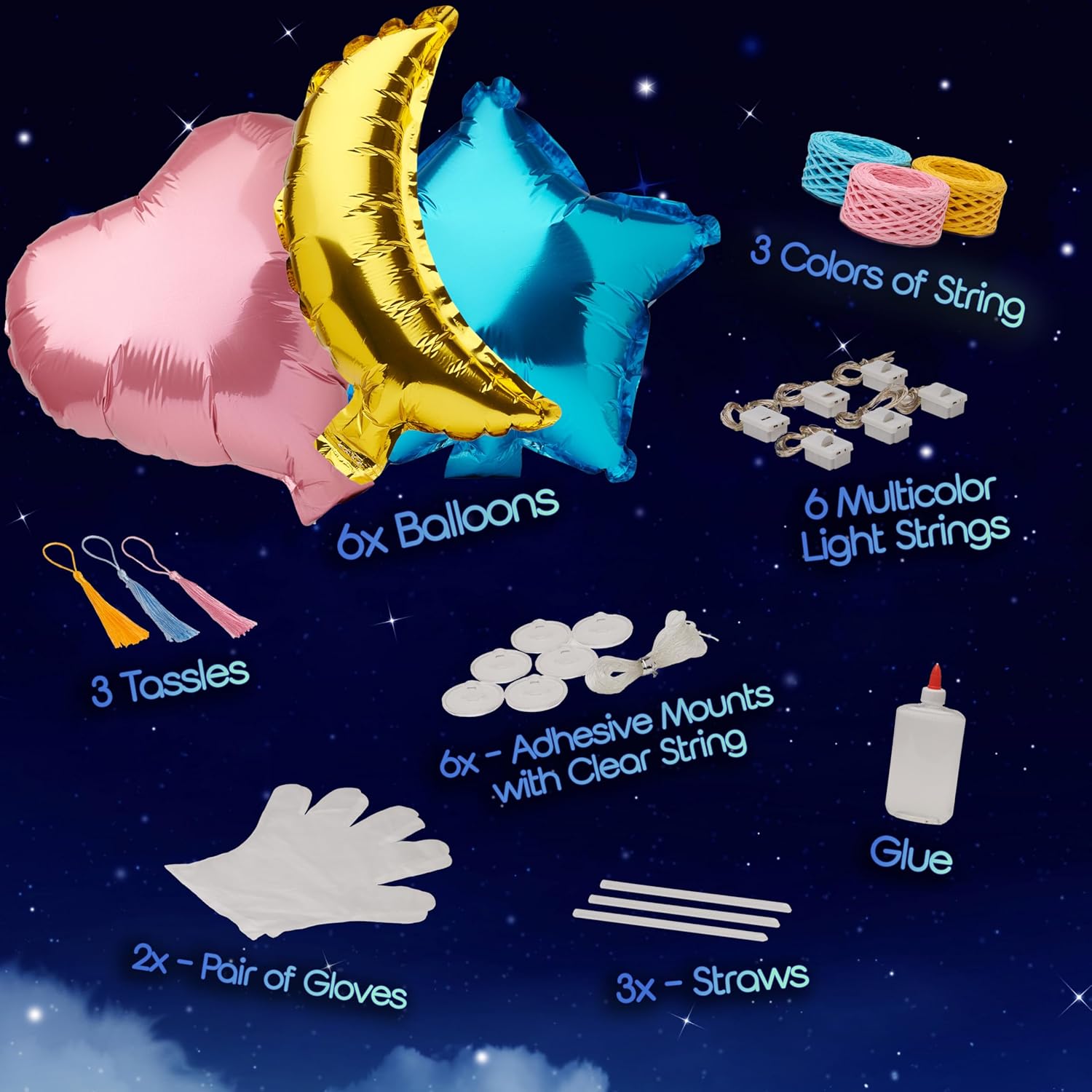 - All-Inclusive DIY Craft Set – Includes 6 balloon shapes (2 each: heart, moon, star), 3 vibrant string colors, 3 tassel colors, 6 mini LED lights, glue, gloves & mounting accessories. Everything your child needs to build glowing 3D art!