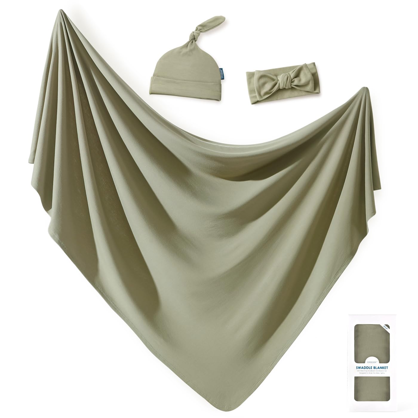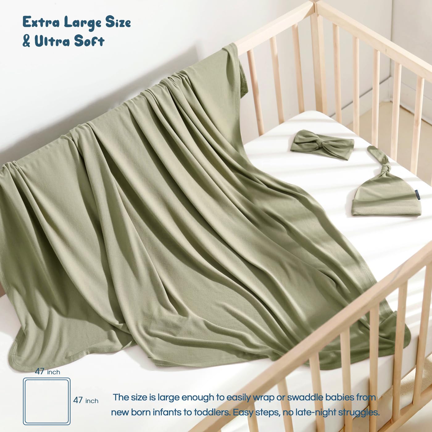 GRSSDER Newborn Swaddle Blanket, Ultra Soft Jersey Receiving Blanket with Matching Headband and Beanie Set, 47×47" Extra Large Nursery Swaddle Wrap for Girls and Boys