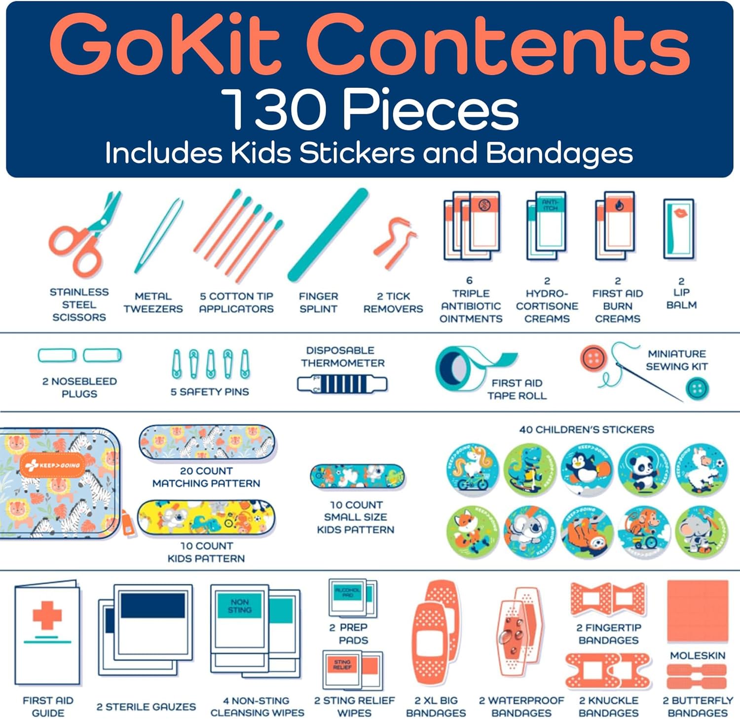 - For Your Family – The average med kit is designed just for adults, but your KEEP>GOING kit works perfectly as a baby first aid kit and beyond. Bandage their boo-boos and put smiles back on their faces!
