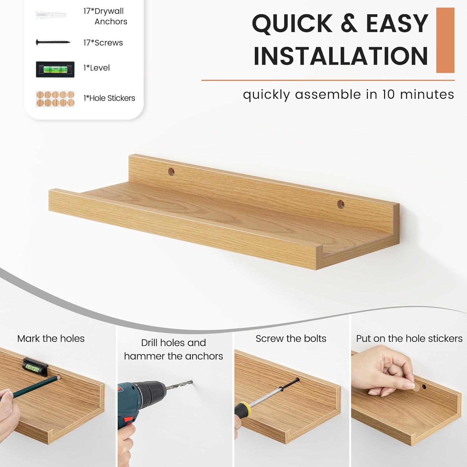 - 【Easy to Install】FLYJOE picture ledge shelves are quick and easy to install! Each set comes with pre-drilled holes and all necessary hardware, including a mini level for perfect alignment. With simple instructions, you can have your shelves up in minutes, allowing you to start decorating right away